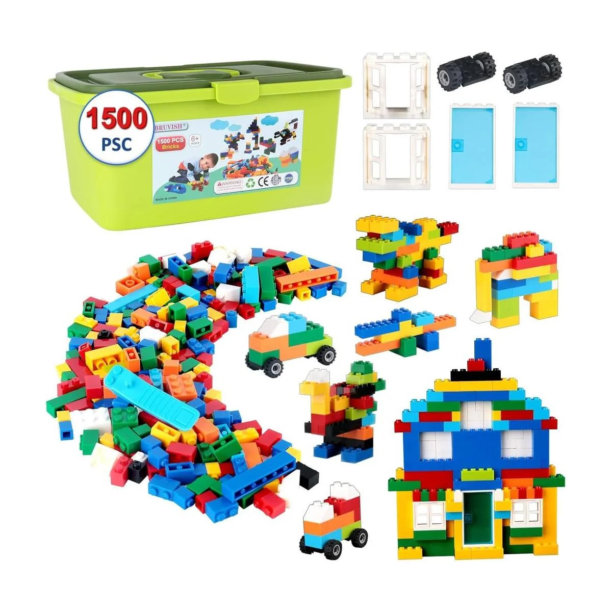 BRUVISH Ladrillos de construcción de 1500 piezas, bloques de construcción clásicos básicos de colores aleatorios, 8 formas, 1500 ladrillos de construcción a granel para niños a partir de 3 años, con caja de almacenamiento, compatible con todas las principales marcas
