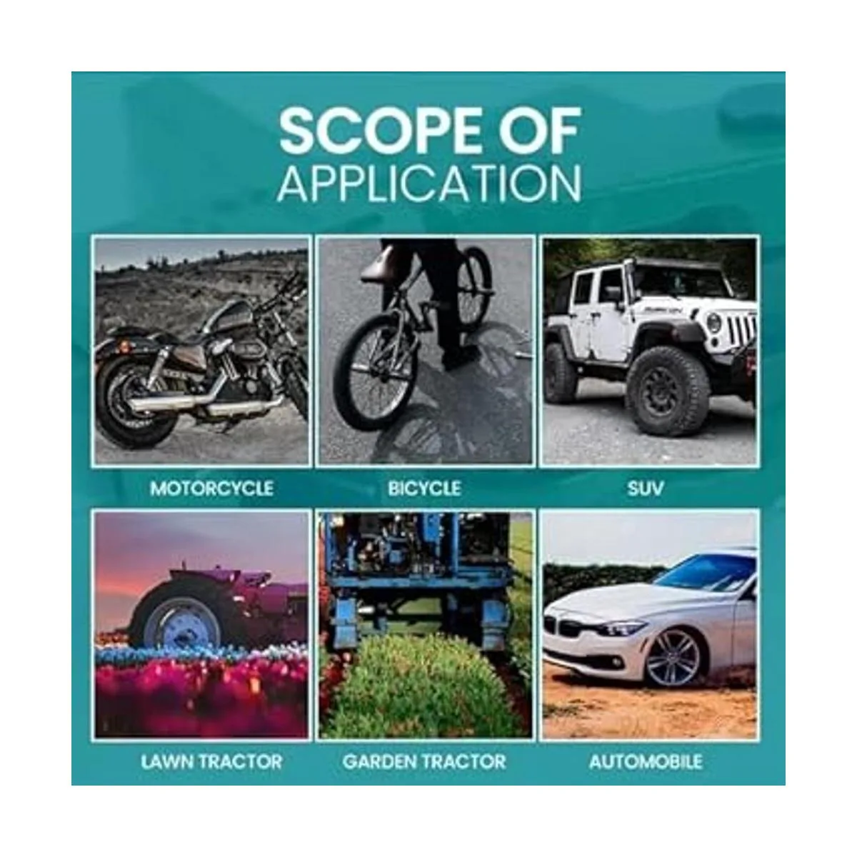Esta herramienta es muy adecuada para motocicletas, bicicletas, vehículos todoterreno, ATV, tractores de césped, tractores de jardín, coches y más tipos de vehículos.