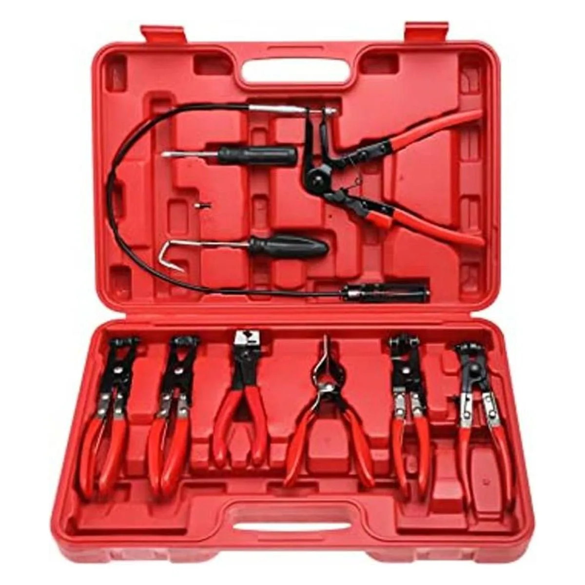 El juego de alicates de abrazadera de manguera de 9 piezas tiene todo lo que necesitas para desmontar un motor y reemplazar mangueras de combustible, aceite y agua; las herramientas incluidas aprietan las pestañas de abrazadera para eliminar la presión de la manguera; este es un conjunto de herramientas que se deslizan en la cubierta de la pestaña en el lateral del conector y mantienen la pestaña de bloqueo en la posición abierta mientras las tiras