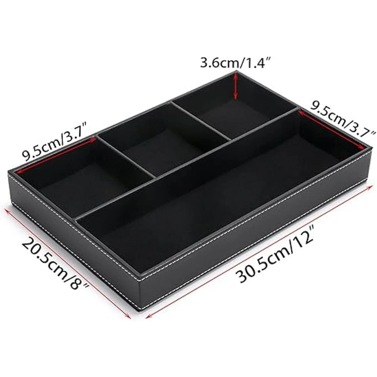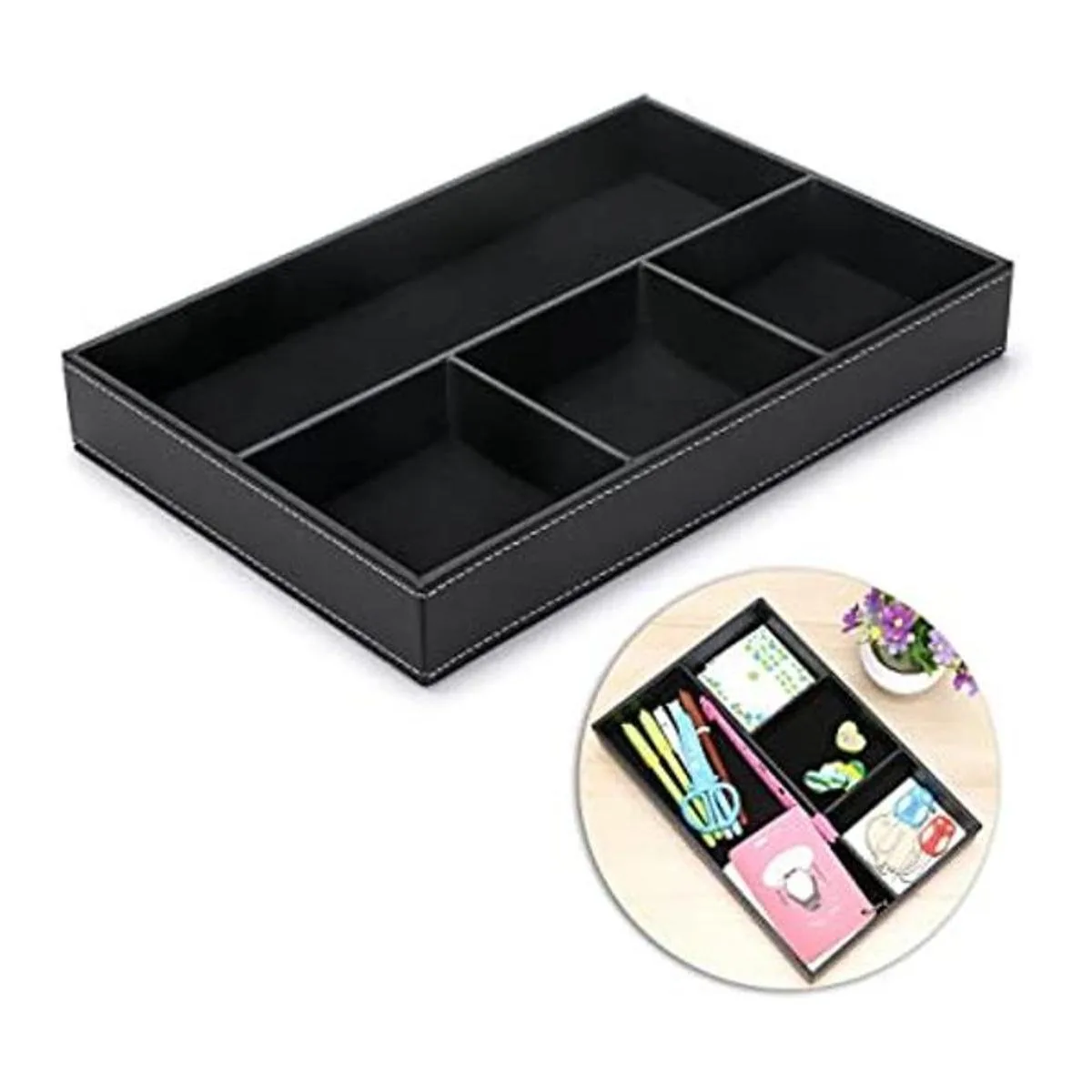 BTSKY Organizador de cajones de escritorio Bandeja plana de 4 ranuras de piel para cajones, suministros de oficina, artículos de papelería, artículos de sol, contenedor, organizador superior, Negro con azul