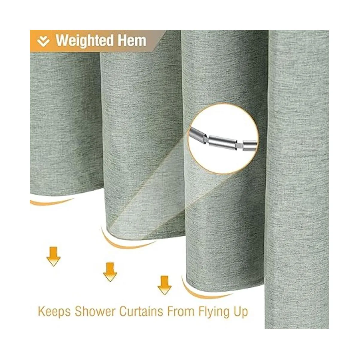 Textura de lino: hecho de tela de poliéster de alta calidad de 8.11 oz/m, que no es tóxica, resistente a las arrugas y no se decolora. Además, el diseño de dobladillo pesado puede mantener su forma y no se mueve como las cortinas de ducha ligeras