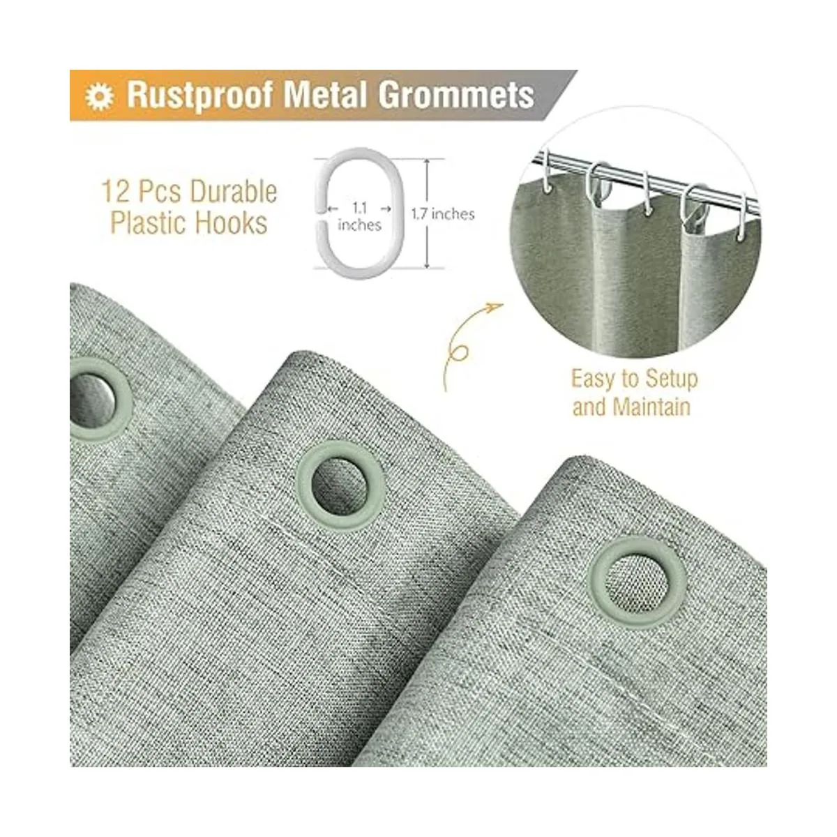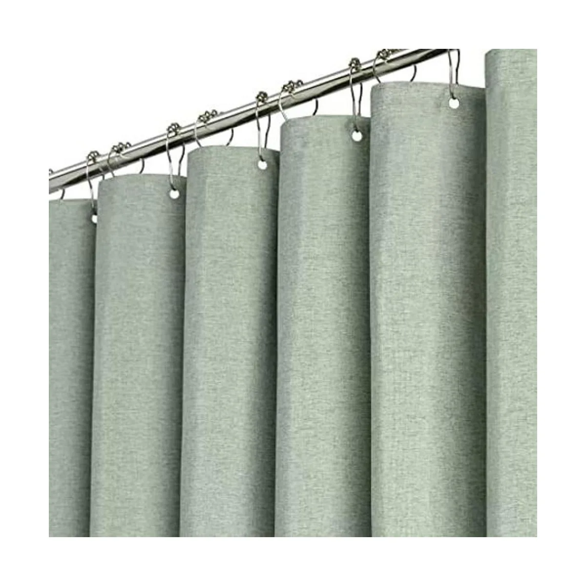 Tamaño estándar: 71.7 x 71.7 in. 12 ojales de metal inoxidables para evitar desgarros que se adaptan a la mayoría de ganchos o anillos de ducha estándar. El paquete incluye 1 cortina de ducha verde salvia y 12 ganchos de plástico conveniente de instalar.