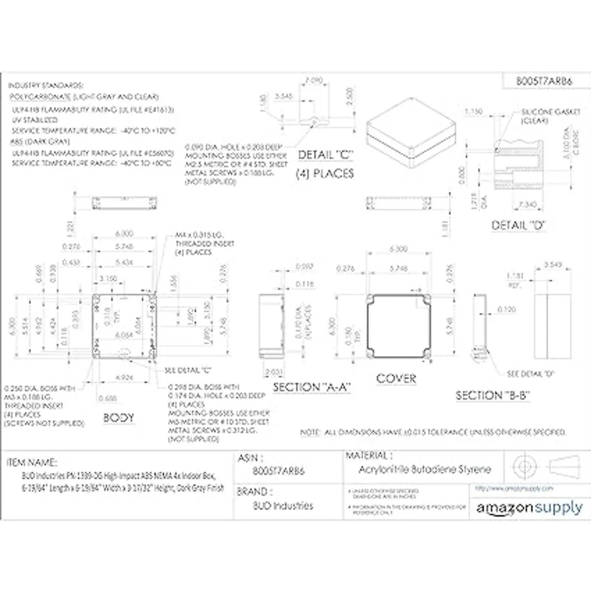 Bud Industries pn1339dg highimpact ABS NEMA 4 X interior Caja, 6 1964 de longitud x 6 1964 ancho x 3 1732 Altura, Gris oscuro de acabado