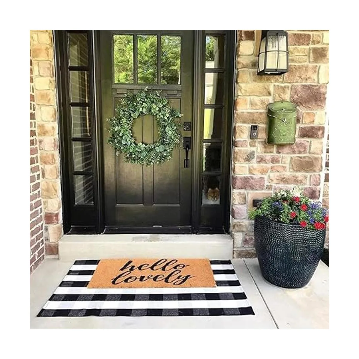 Tamaño personalizado para el felpudo de Hello Doormat: 35.4 x 59 pulgadas para refrescar la decoración de tu porche al colocar esta alfombra de exterior a cuadros en blanco y negro con un felpudo de hola Tu puerta principal estará lista para Instagram