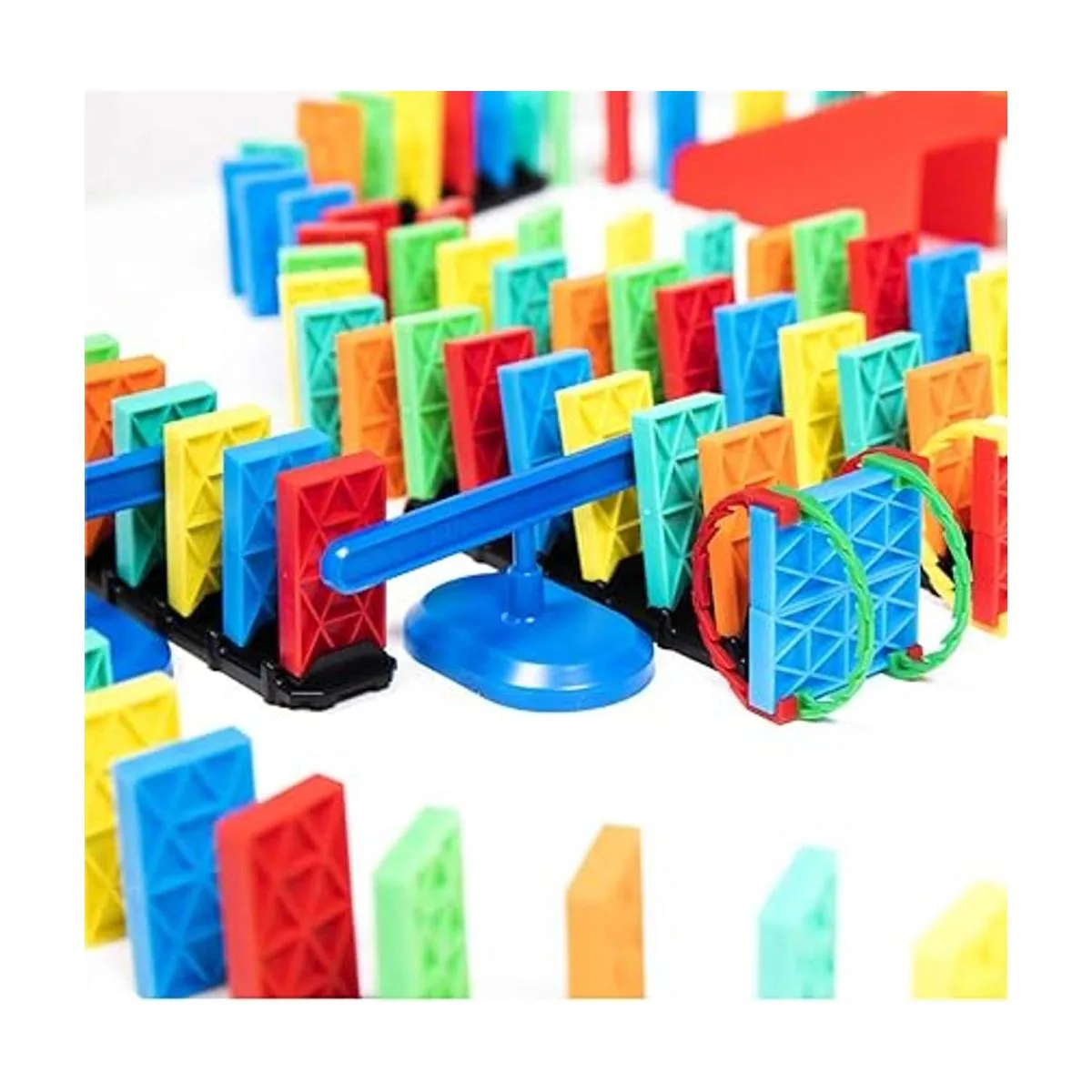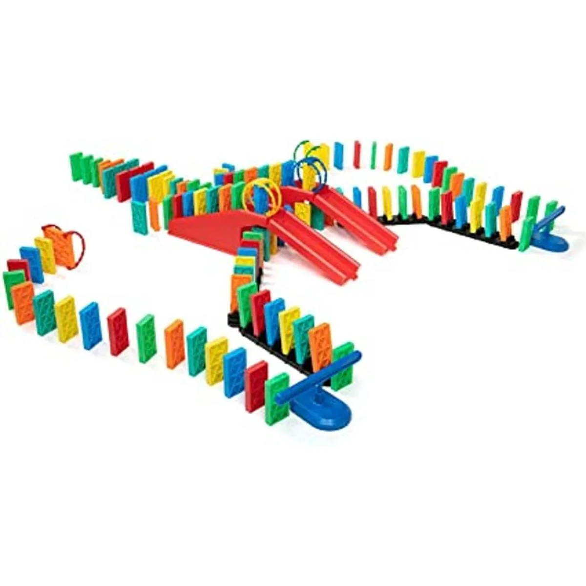 Incluye: 120 dominó cinéticos, 12 arcos, 5 pistas rápidas, 1 puente, 2 pistas rectas, 2 spinners y 1 plantilla.