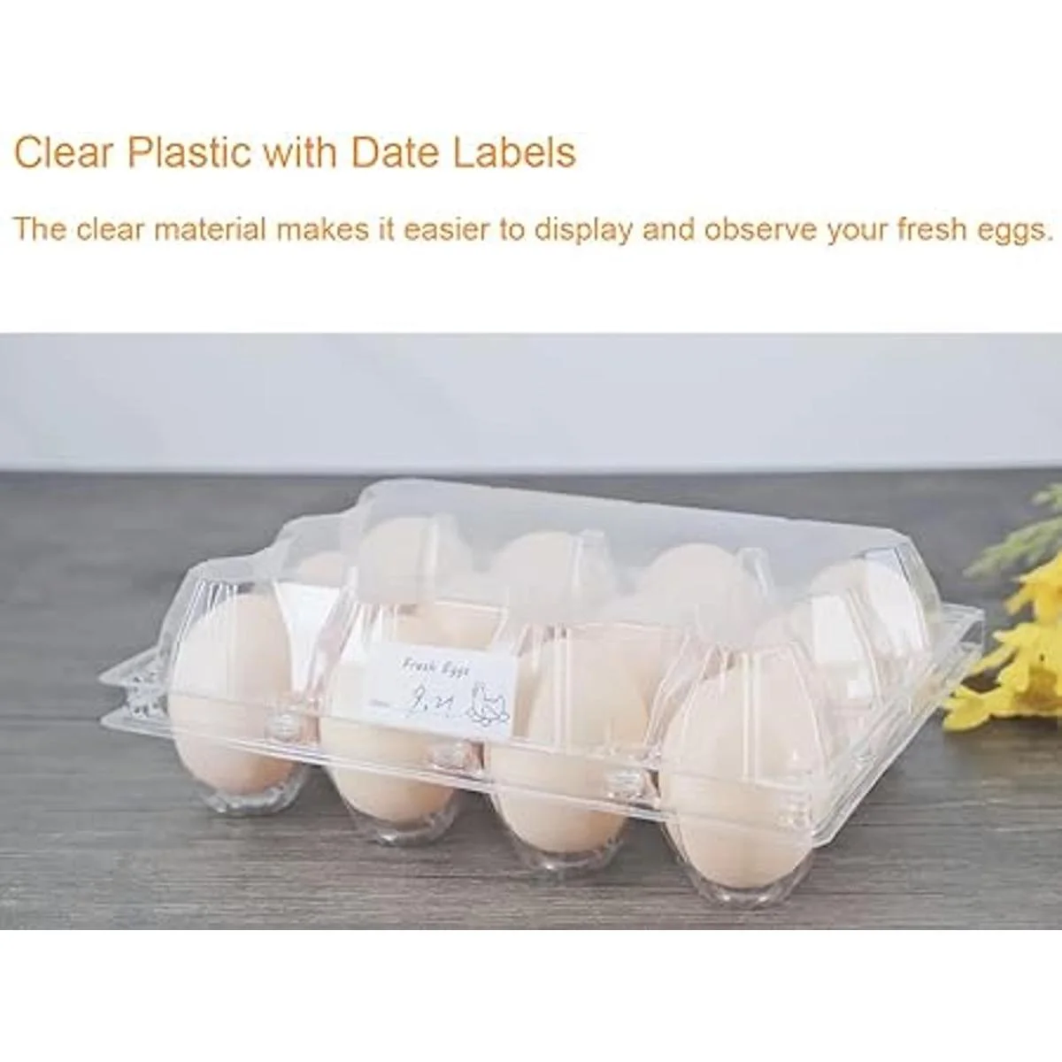 El paquete incluye: 60 paquetes de cajas vacías de plástico transparente cada una tiene capacidad para hasta 12 huevos, 60 etiquetas de fecha adicionales.