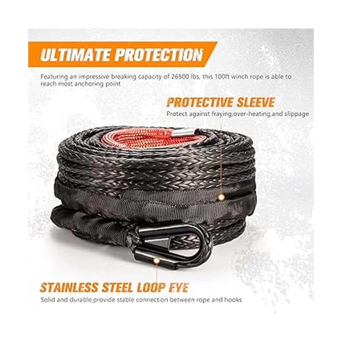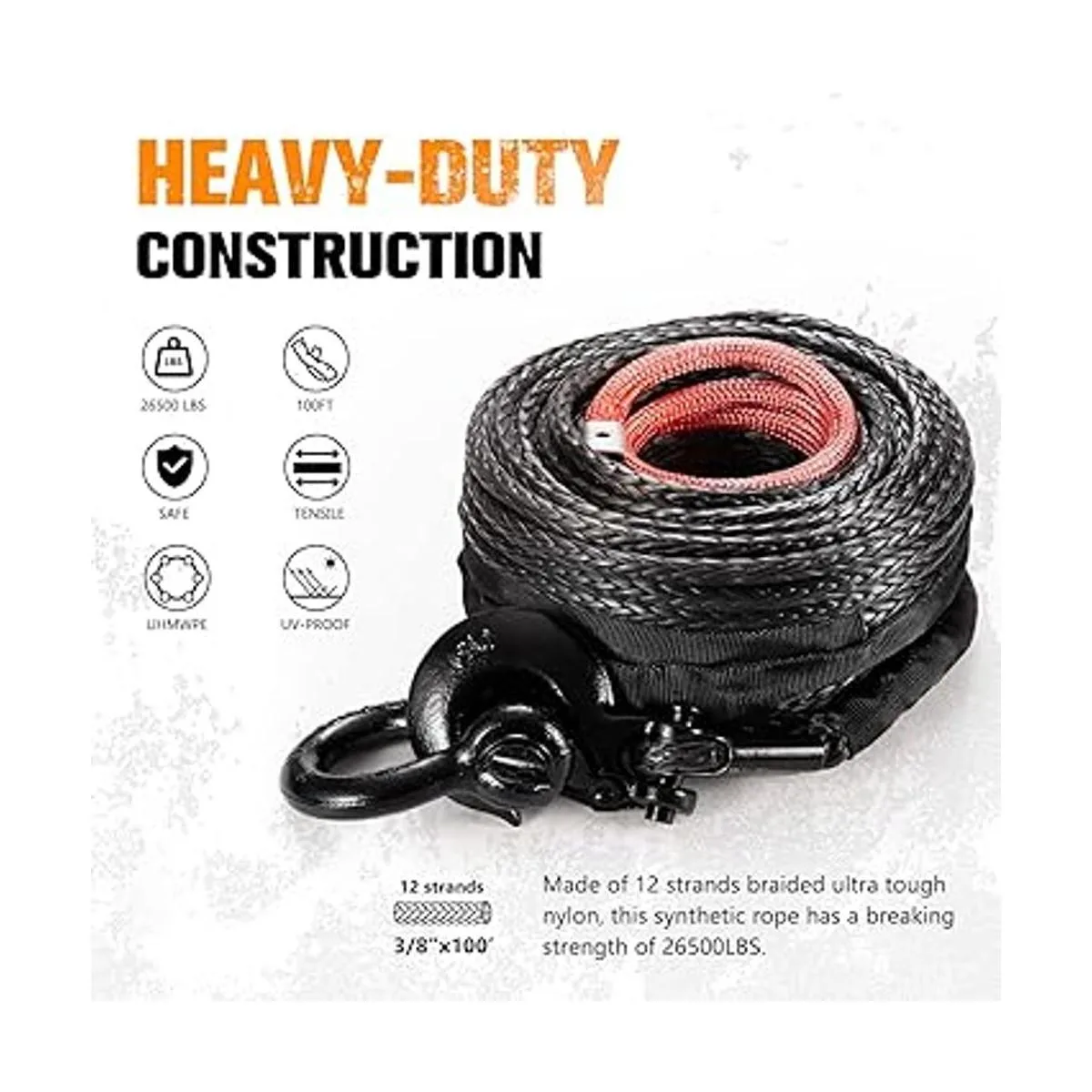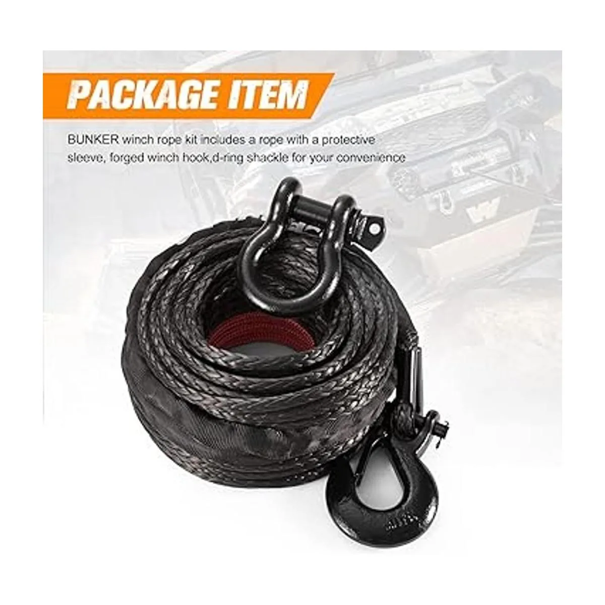 BUNKER INDUST Kit de cuerda de cabrestante sintético, línea de cable de cabrestante de 100 pies 38 pulgadas, 26500 libras, con funda protectora gancho de cabrestante forjado grillete de anillo en D para 4WD, todoterreno, camión, ATV, UTV, SUV, Jeep Winch Accesorio