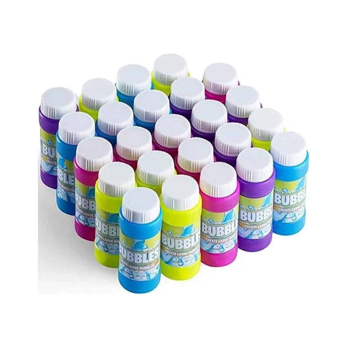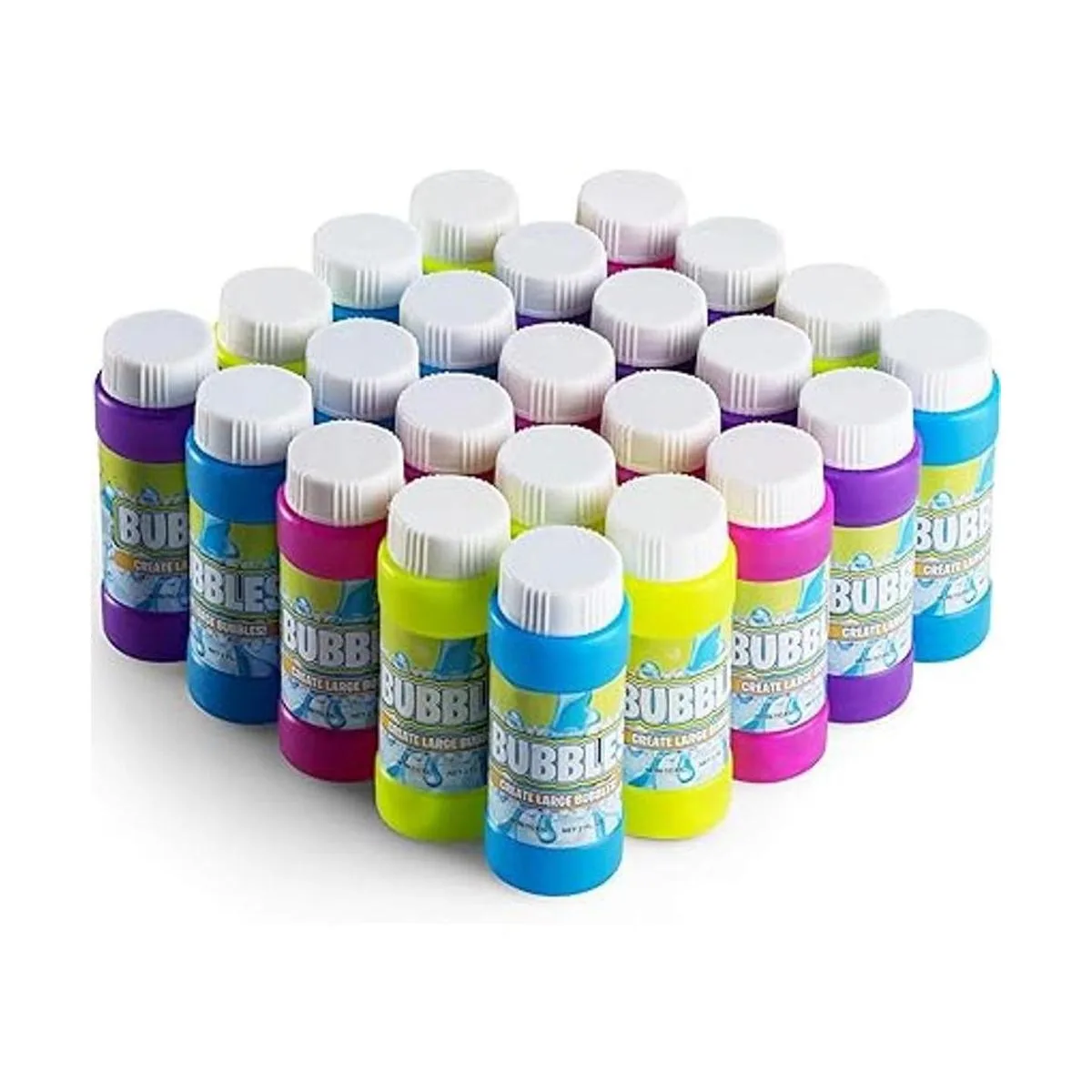Burbujas de fiesta para niños paquete a granel de 24 Solución de botella de burbujas de 2 onzas con varitas de burbujas en varios colores de neón para juegos de verano al aire libre, recuerdos de fiesta de cumpleaños y rellenos de bolsas de golosinas