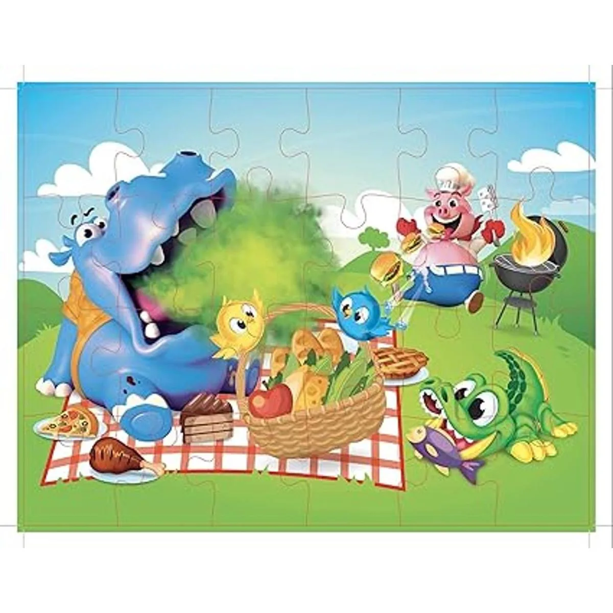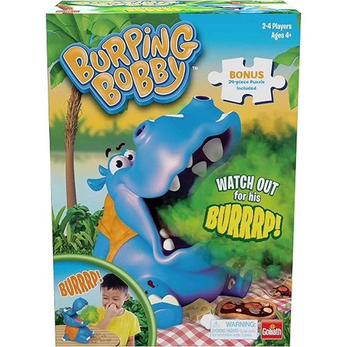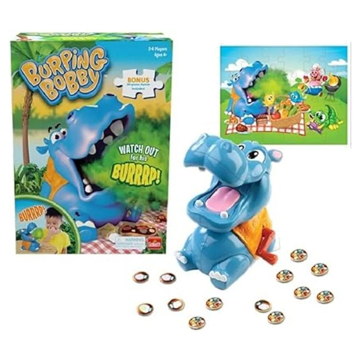 Burping Bobby The Feed The Hipopótamo, pero ten cuidado con su eructo. Juego Incluye un divertido rompecabezas colorido de 24 piezas de Goliath