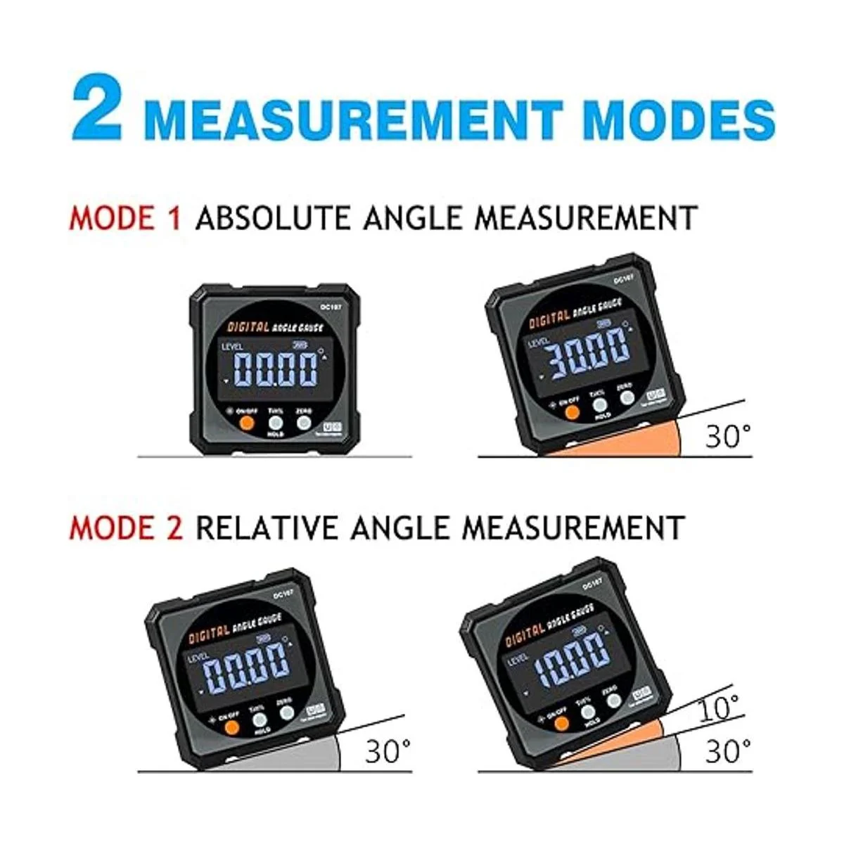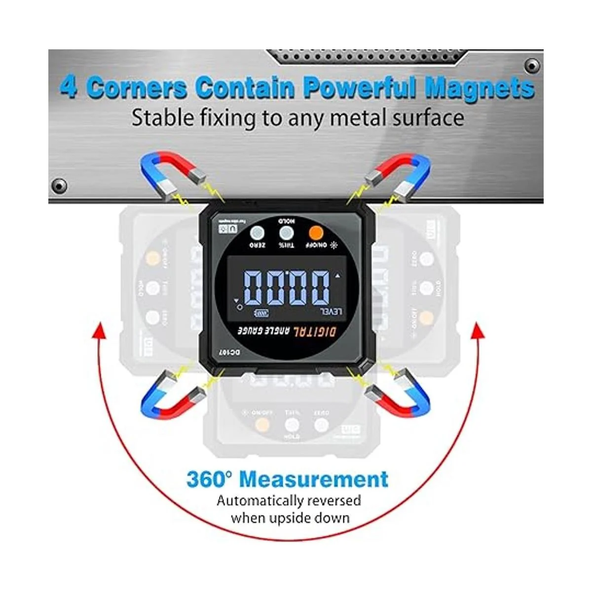 Pequeño cubo brillante: 2.4 pulgadas, ancho 2.4 pulgadas, alto 1.2 pulgadas, tamaño de bolsillo portátil con bolsa de cinturón a juego. Microprocesador preciso de 0,2 con inversión automática cuando está boca abajo. La medición de 4 x 90 se puede utilizar en muchos ángulos y se puede poner a cero en cualquier ángulo para comparación.