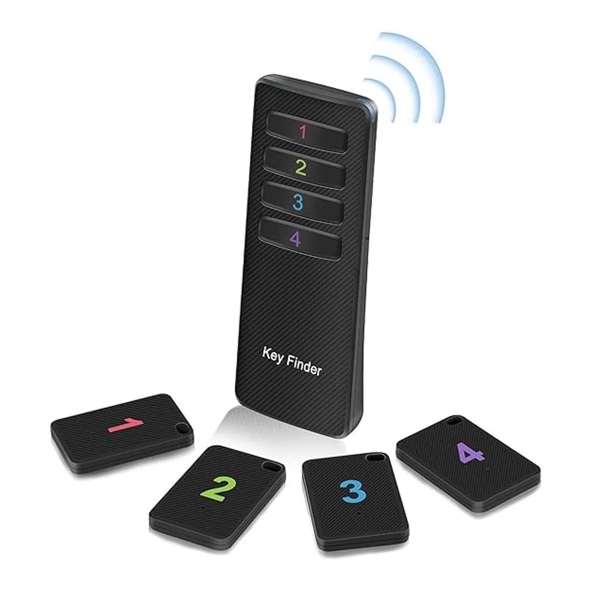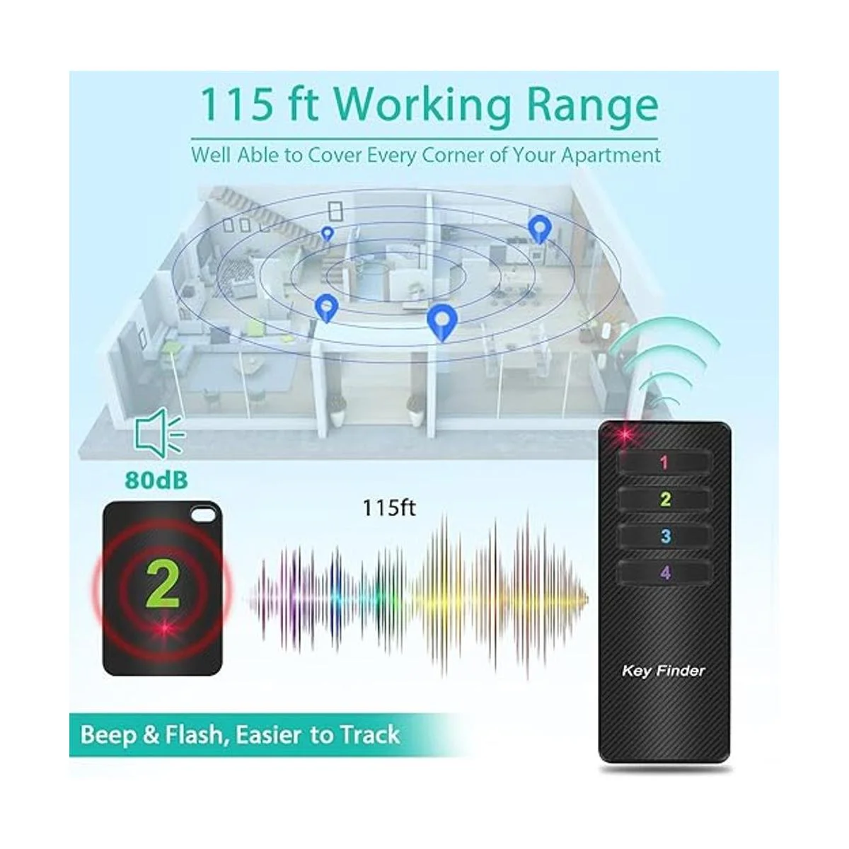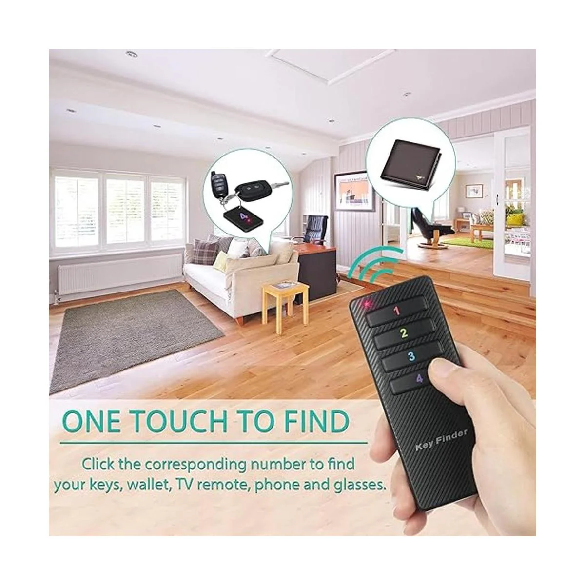 Buscador de llaves, buscador de control remoto de TV Dispositivo Find My Keys, paquete de 4 buscadores inalámbricos de llaves de coche que hacen ruido Rastreador de llaves RF de alcance de 115 pies 80 dB, buscador de teléfonocartera con 4 etiquetas localizadoras de artículos