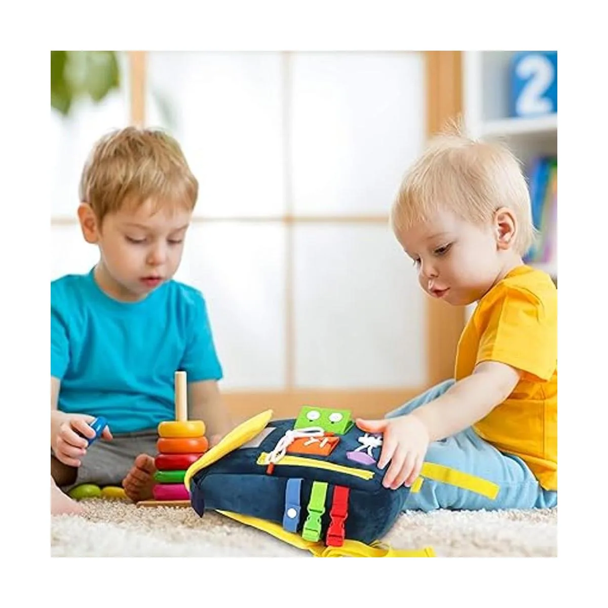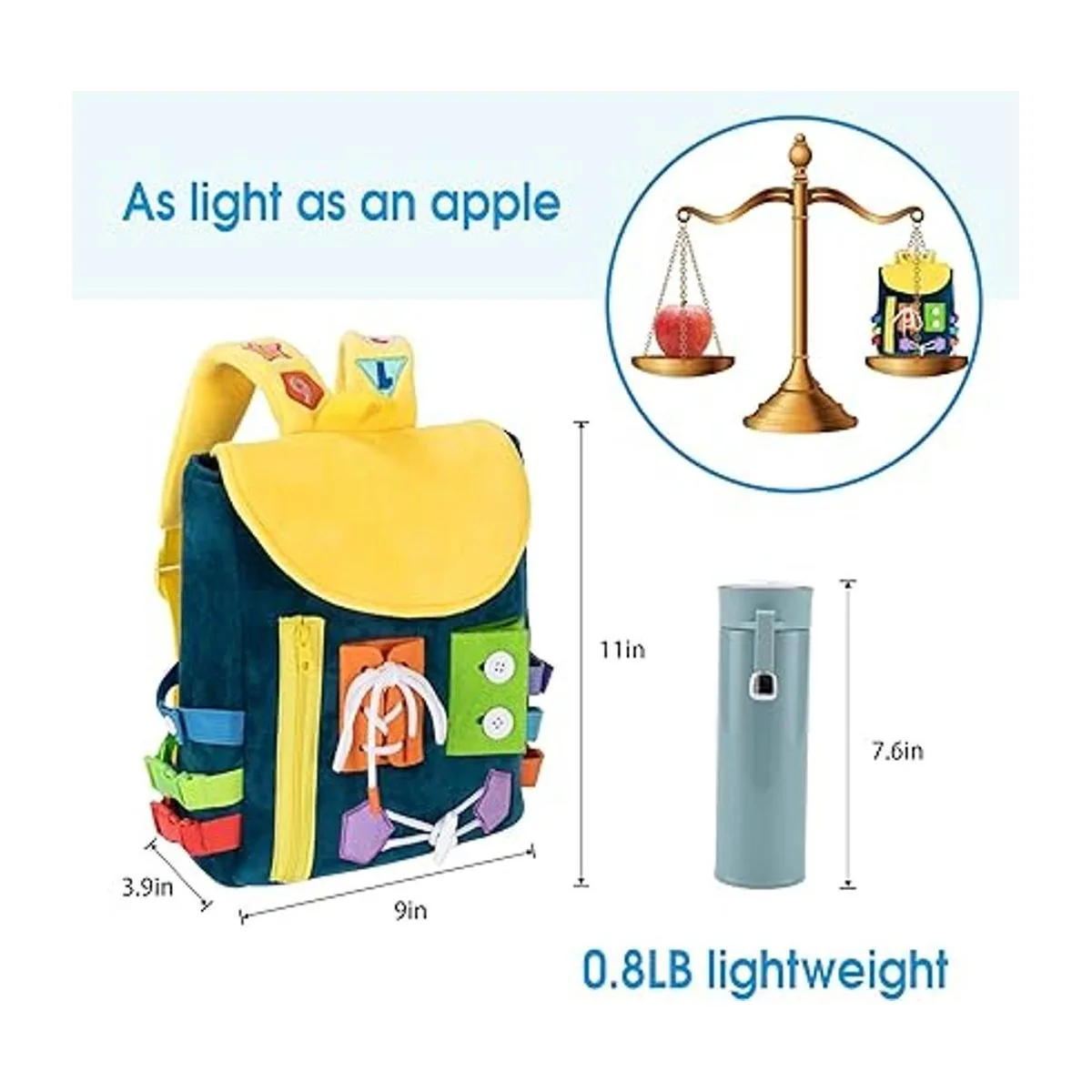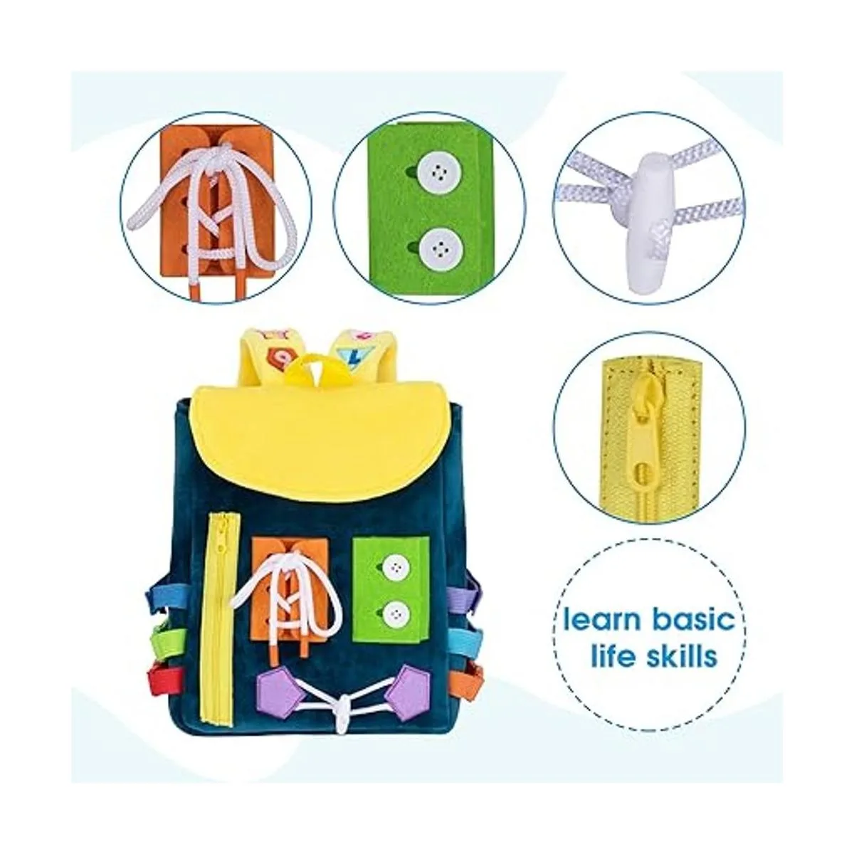 Busy Board Mochila para niños pequeños con hebillas y juguetes de actividad de aprendizaje, desarrolla habilidades motoras finas y habilidades básicas para la vida, aprende a atar zapatos, juguete de viaje para niños, regalo ideal para más de 12 meses