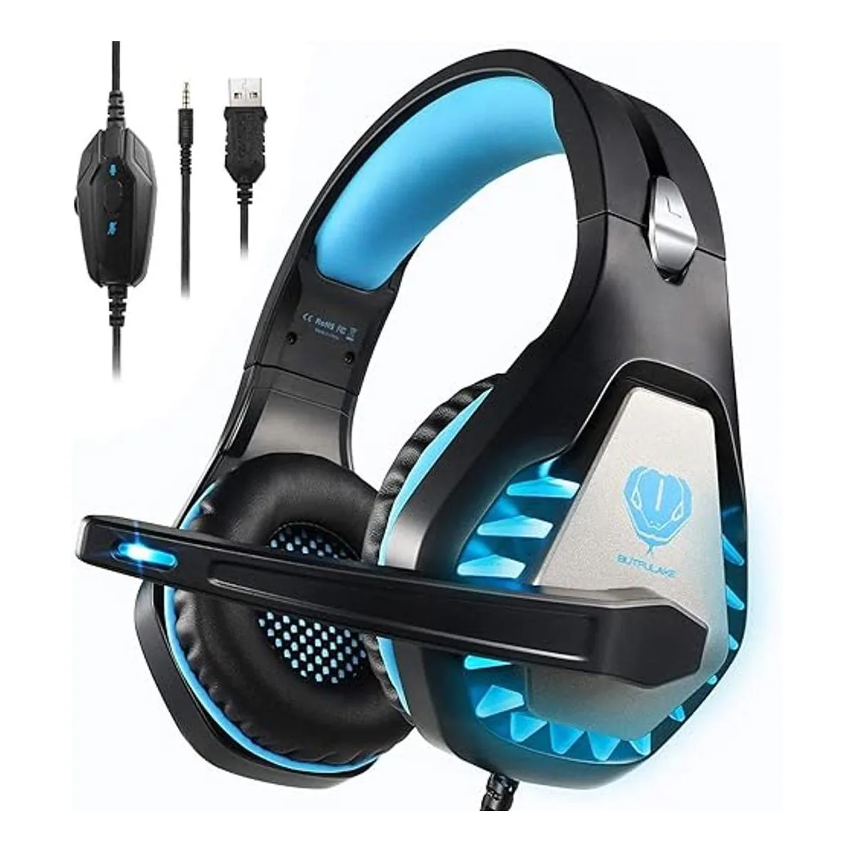 BUTFULAKE GH1 Auriculares para juegos PS5, PS4, Xbox One, Xbox One S, PC, Nintendo Switch, Mac, portátil, auriculares estéreo Pro con cable de 0.138 in con micrófono con cancelación de ruido, luz LED, color azul