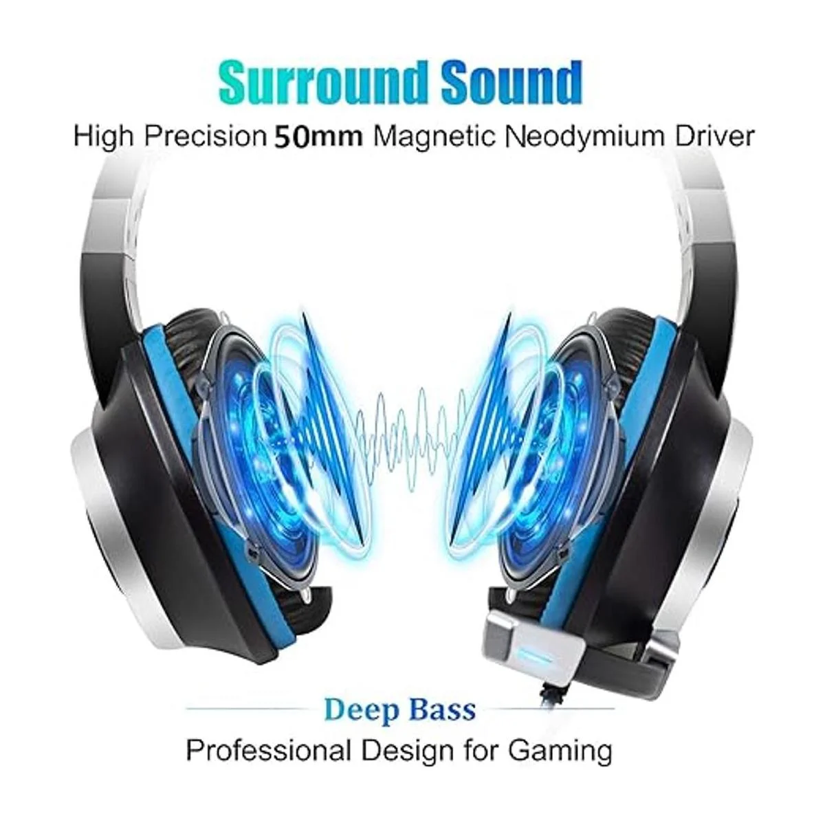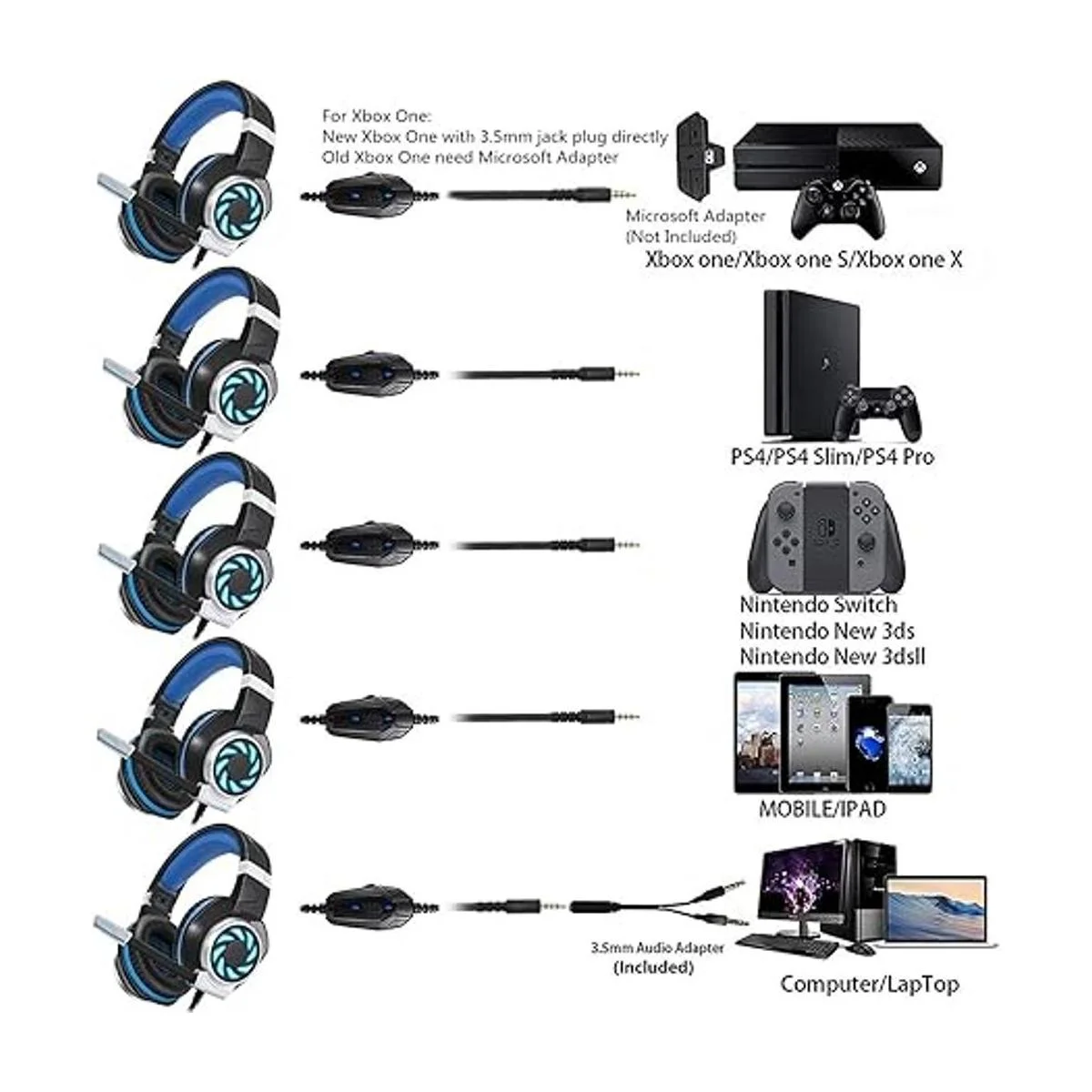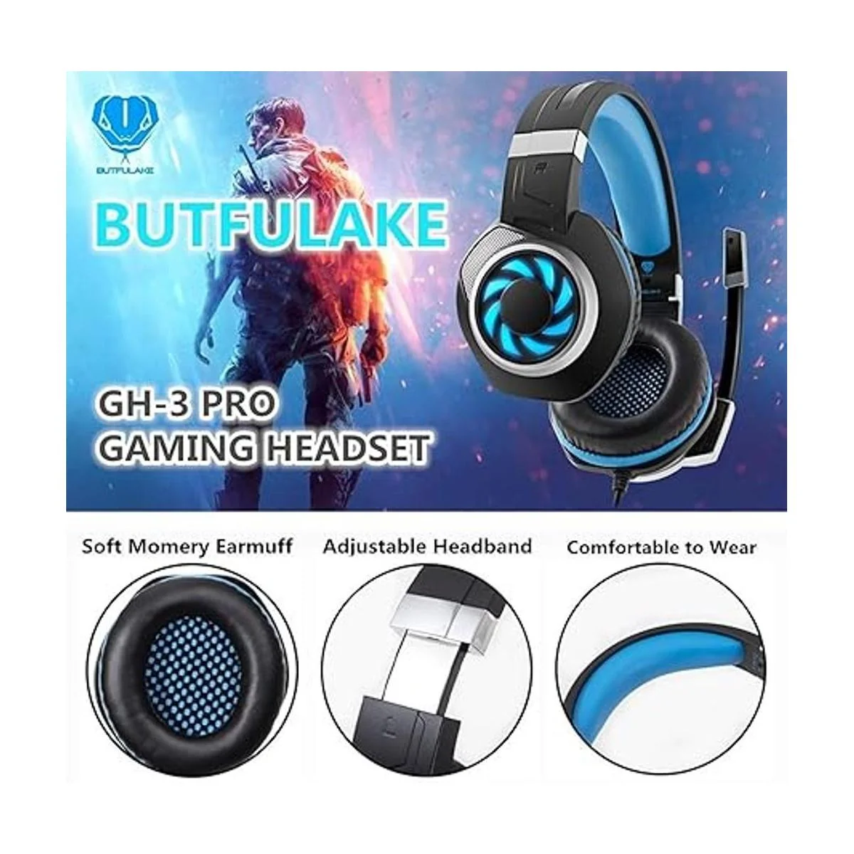 BUTFULAKE GH3 Auriculares para juegos para Xbox One, Xbox One S, PS4, PC, Nintendo Switch, Mac, laptop, 0.138 in con cable para juegos con luz LED, micrófono con cancelación de ruido, negro y azul