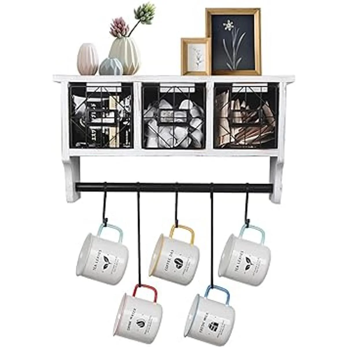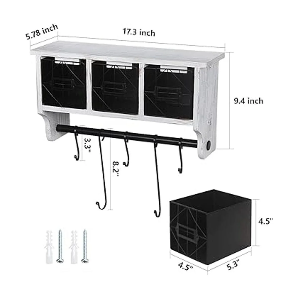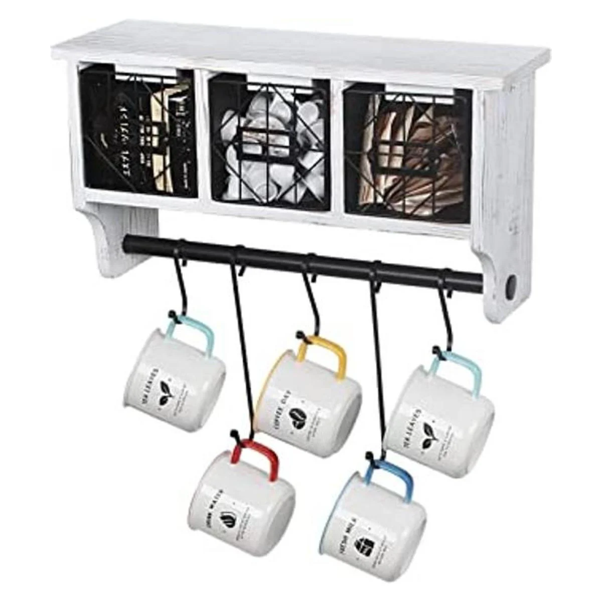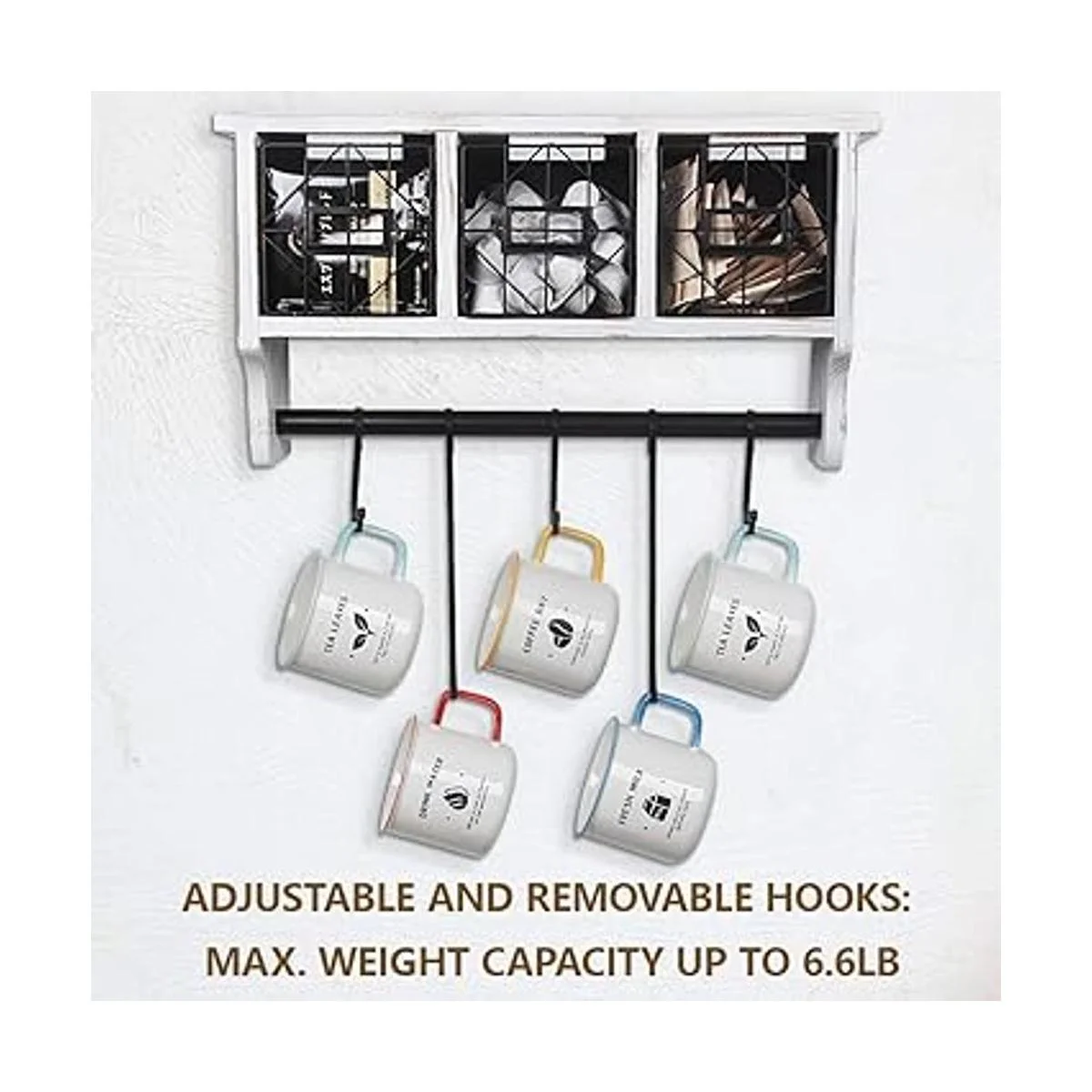 Butizone Perchero rústico montado en la pared con ganchos y cestas, organizador de almacenamiento y exhibición de tazas de café de madera, estante de entrada colgante para abrigos, sombreros, toallas y llaves, color blanco