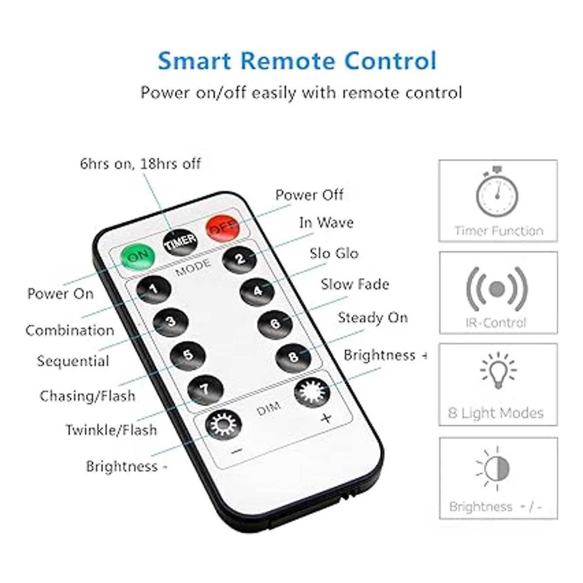 Con control remoto. Esta cadena de luces viene con un control remoto que tiene 13 botones que incluyen 8 modos de luz combinación, onda; secuencial; brillo lento; persecución/flash; desvanecimiento lento; parpadeo/flash; constante. La caja de batería también un botón que puede pasar por estos diferentes modos de luz. Otros botones incluyen encendido, apagado, temporizador y atenuación/iluminación de los LED.