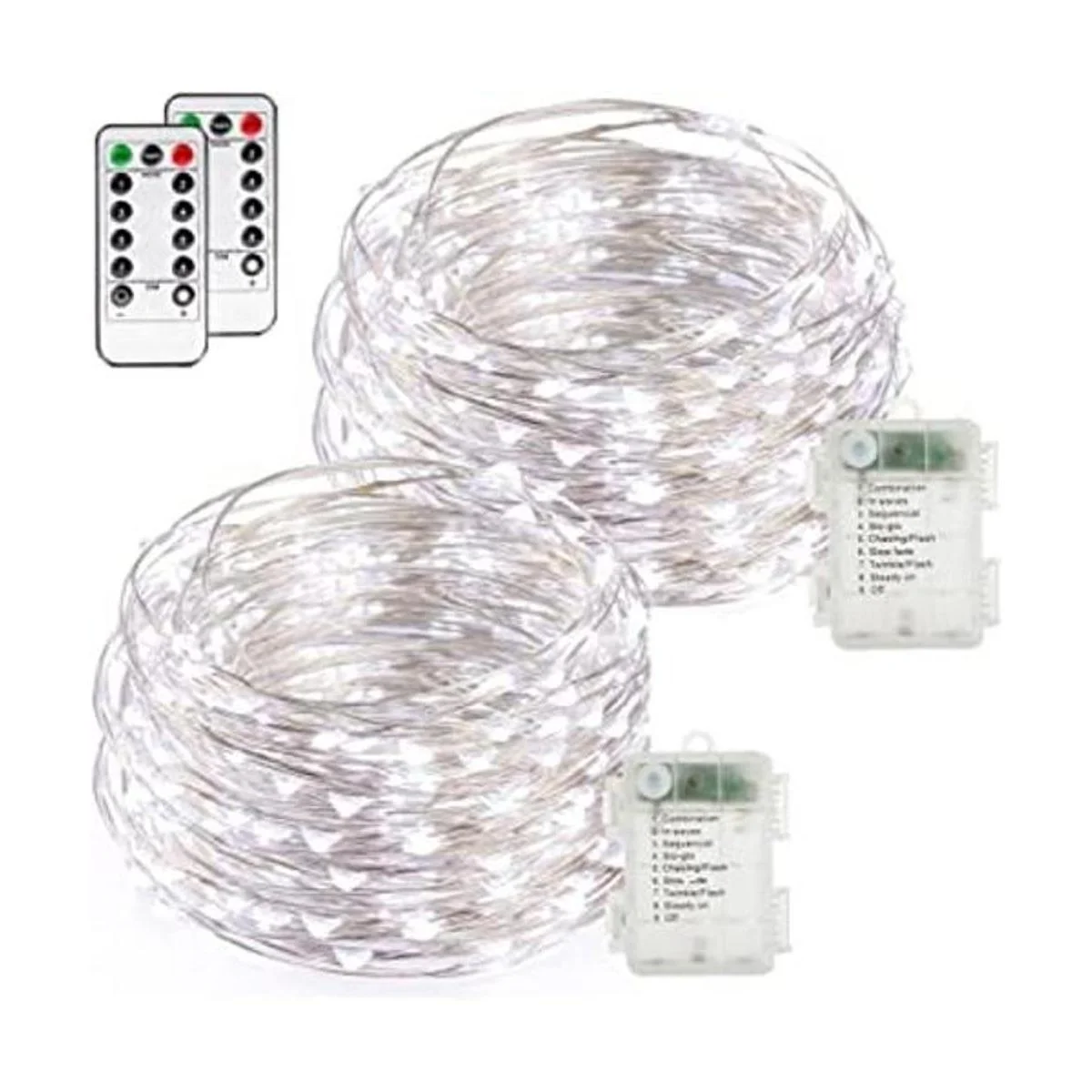 buways Luces de hadas, paquete de 2 unidades, funciona con pilas, impermeable, blanco frío, 50 luces LED, alambre plateado de 16.4 pies con control remoto para fiestas de Navidad, jardín y decoración del hogar