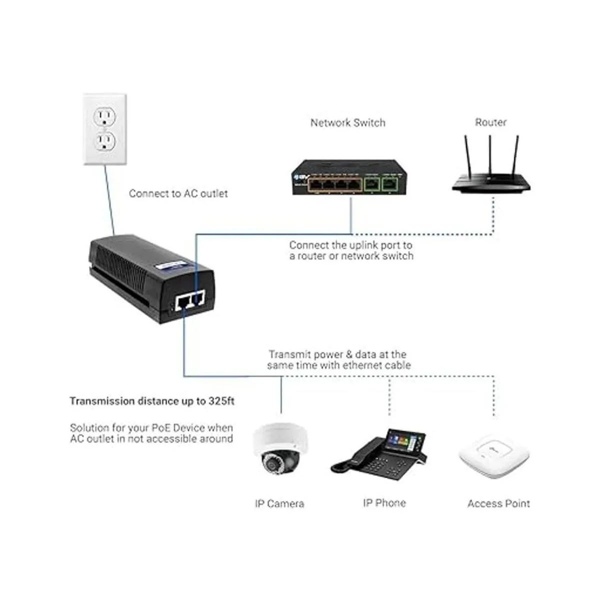 BVTech Inector Gigabit Power Over Ethernet PoE 30W 802.3 afat Plug Play Hasta 325 pies