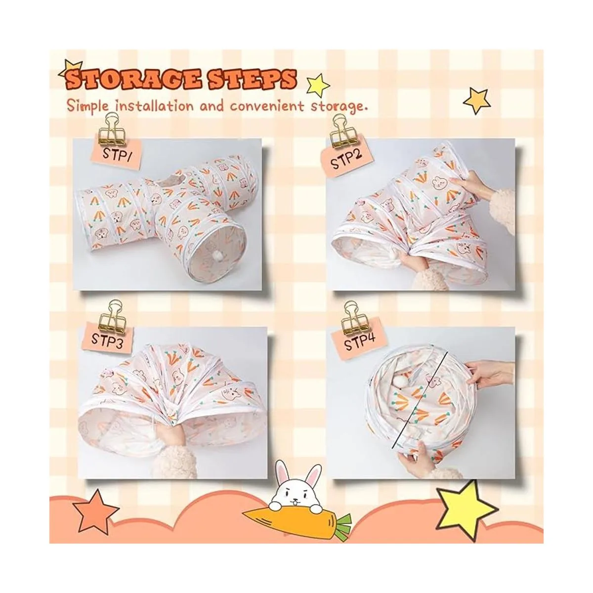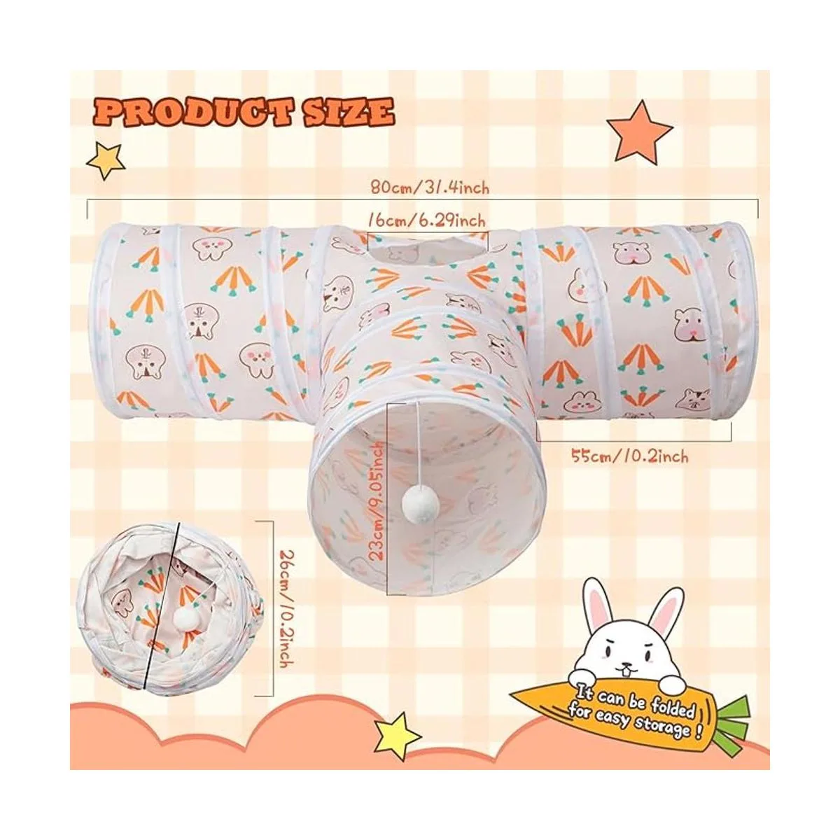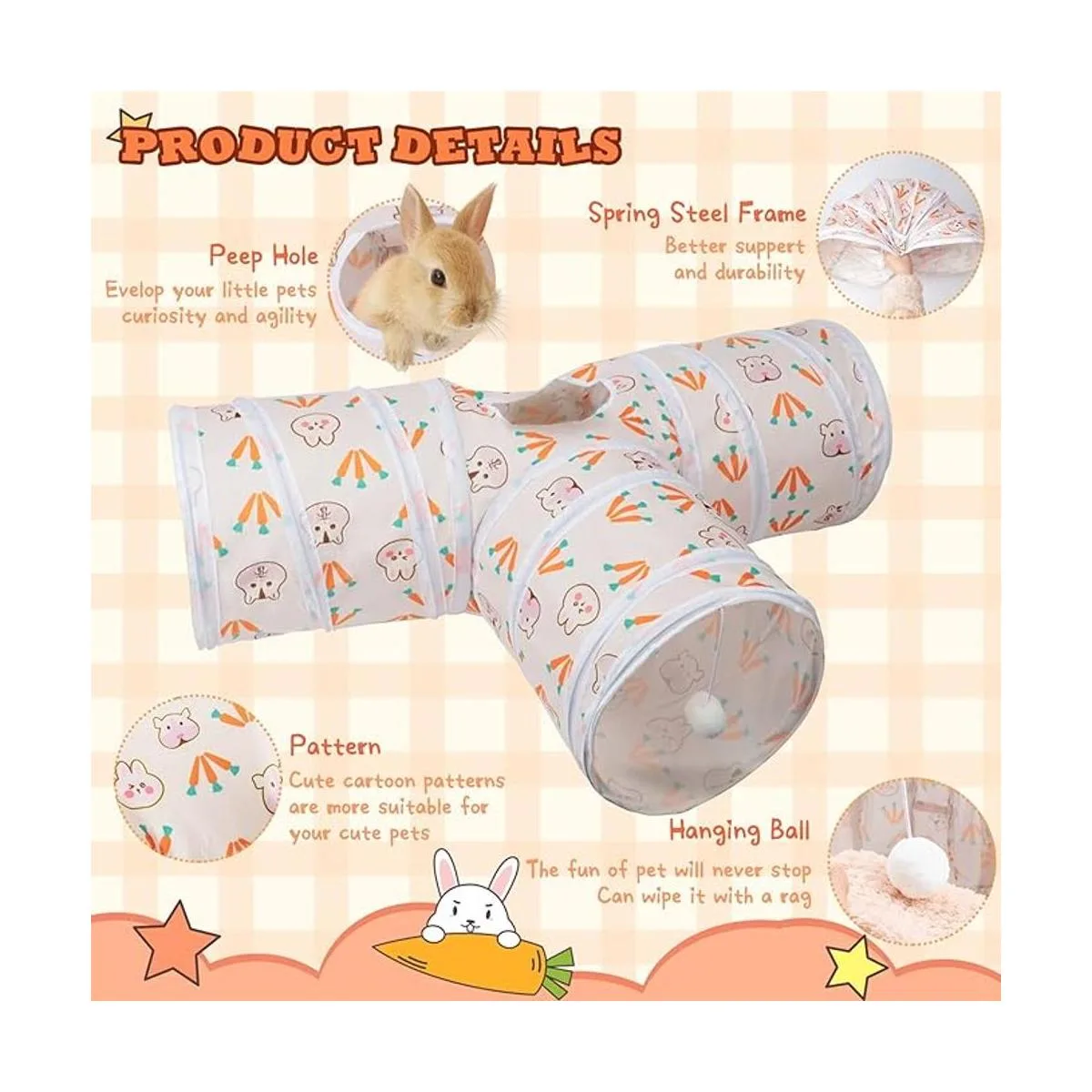 Diseño especial: nuestro túnel de conejo con 3 amplios túneles, mirilla y juguete de bola móvil, este juguete de conejo le da a tu conejo más formas de divertirse, el patrón de zanahoria atraerá a tu pequeña mascota a jugar, manteniendo a tu conejo entretenido durante largas horas.