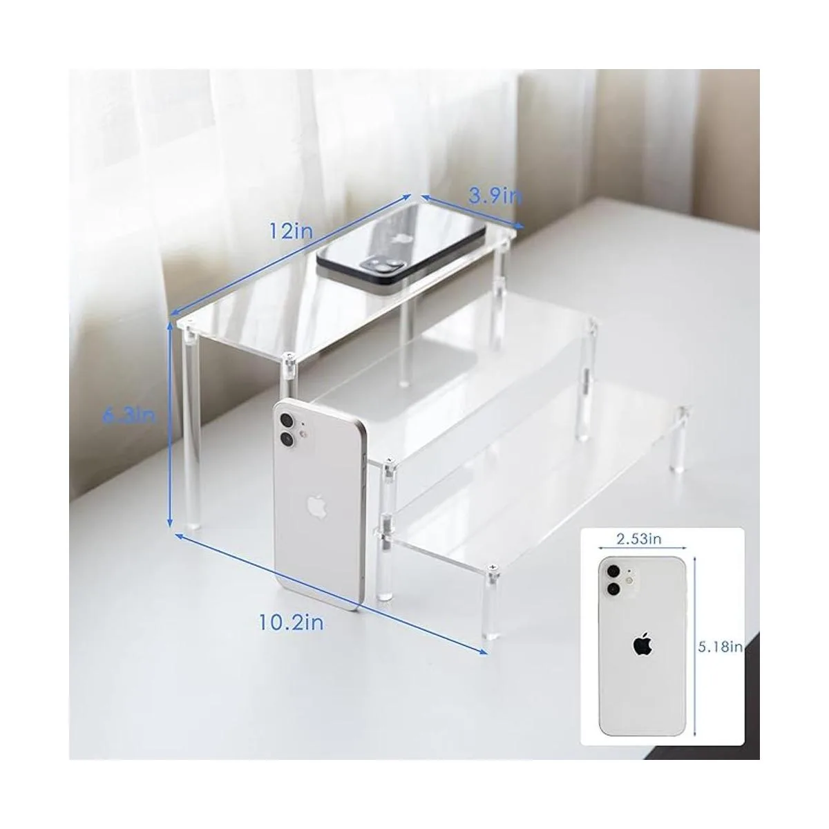 Tamaño: cada panel acrílico mide 12 pulgadas de largo y 3.9 pulgadas de ancho, la altura de cada nivel es de 2 pulgadas, la altura total es de 6 pulgadas.
