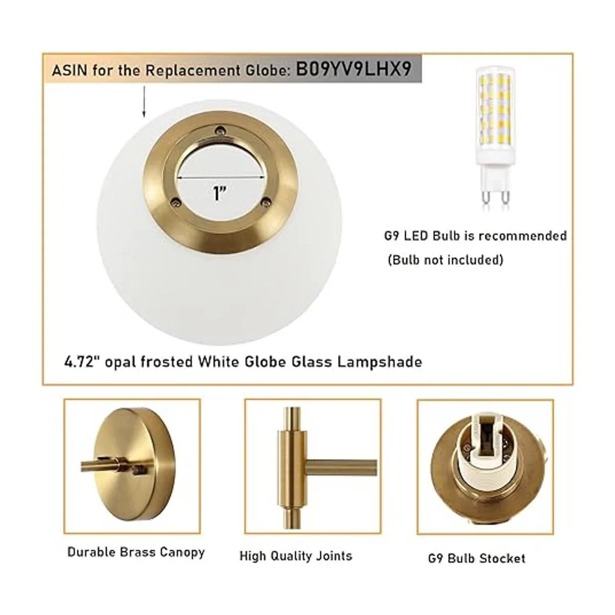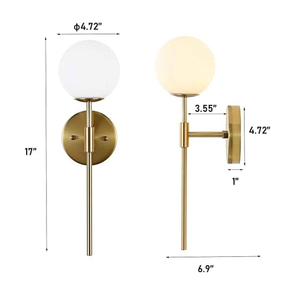 Paquete de 2 lámparas de pared modernas: hechas de metal resistente, con acabado de latón cepillado con pantalla de cristal de globo blanco, candelabro de pared de globo dorado BYOLIIMA no hay necesidad de preocuparse por la oxidación y la decoloración del color. Calidad duradera y elegante, perfecto para estilos de decoración de mediados de siglo y combina el estilo contemporáneo y vintage.