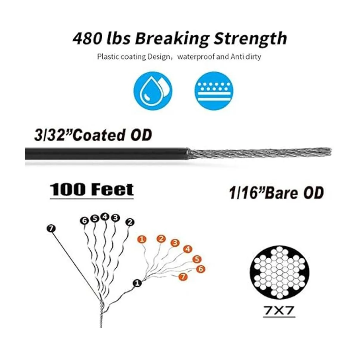Kit para colgar luz al aire libre: este cable 7 x 7 diámetro exterior desnudo es de 1/16 pulgadas, diámetro exterior recubierto es de 3/32 pulgadas; tiene cadena de luces al aire libre de 100 pies, resistente a la intemperie, kit de colgante de alambre, cadena de luces de acero inoxidable, etc