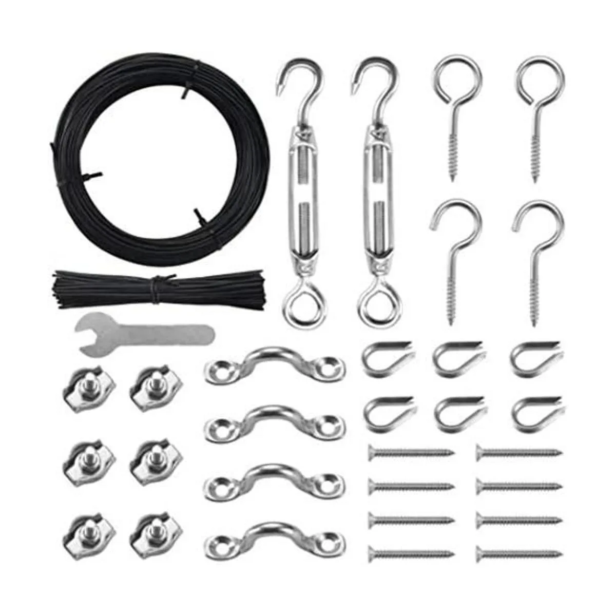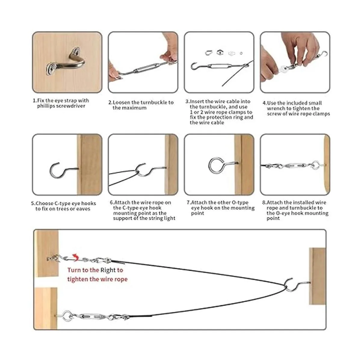 Cable guía perfecto para colgar luces de cadena de exteriores: después de repetidas pruebas y verificaciones, nos aseguramos de que el juego de piezas sea suficiente para garantizar que la cadena de luces pueda ser estable, duradera y colgar de forma segura.