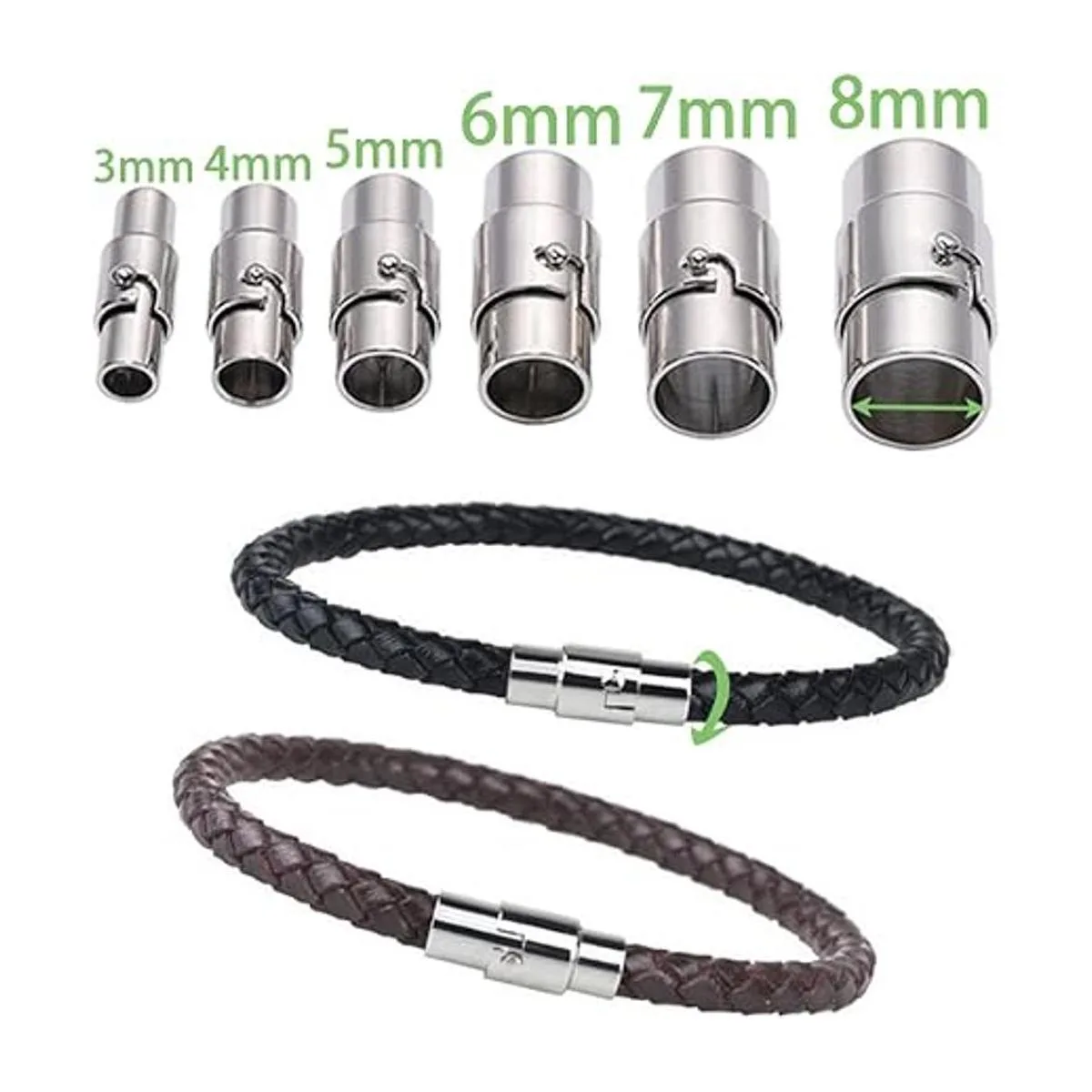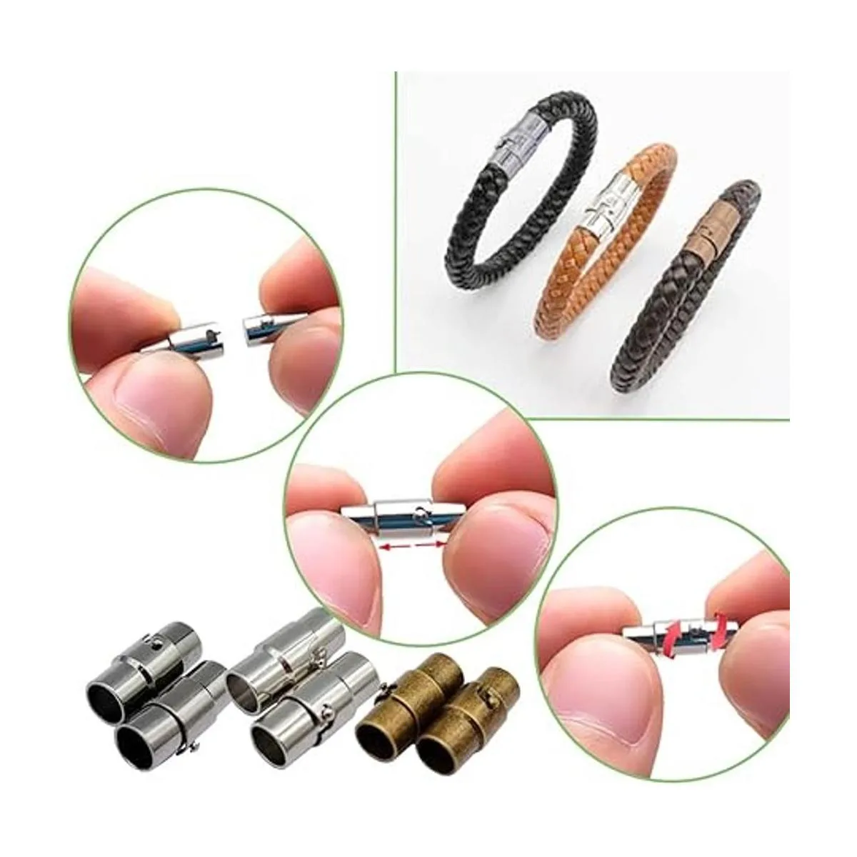 Diseño único: como puedes ver, cuando utilices esos cierres magnéticos para hacer pulseras, necesitas utilizar pegamento para pegar los extremos del cordón de cuero o otro extremo de la cuerda en el cierre magnético que es diferente de los demás, para que los nudos de las pulseras no queden expuestos.