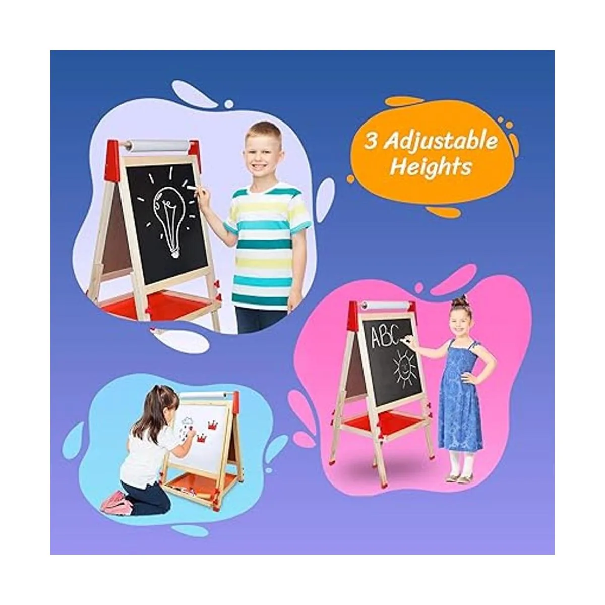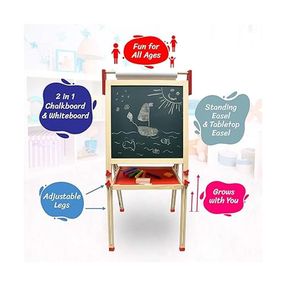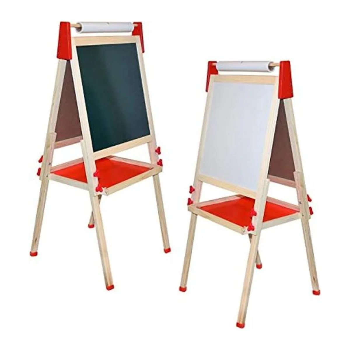 Caballete grande de madera de doble cara: este caballete único para 2 está diseñado para el doble de diversión Cuenta con un caballete de 2 caras, 1 con una pizarra y 1 con una pizarra blanca de borrado en seco, un rollo de papel de 16.4 ft, bandeja de suministros de arte, 4 tizas, 1 borrador en seco e instrucciones fáciles de seguir idioma español no garantizado.