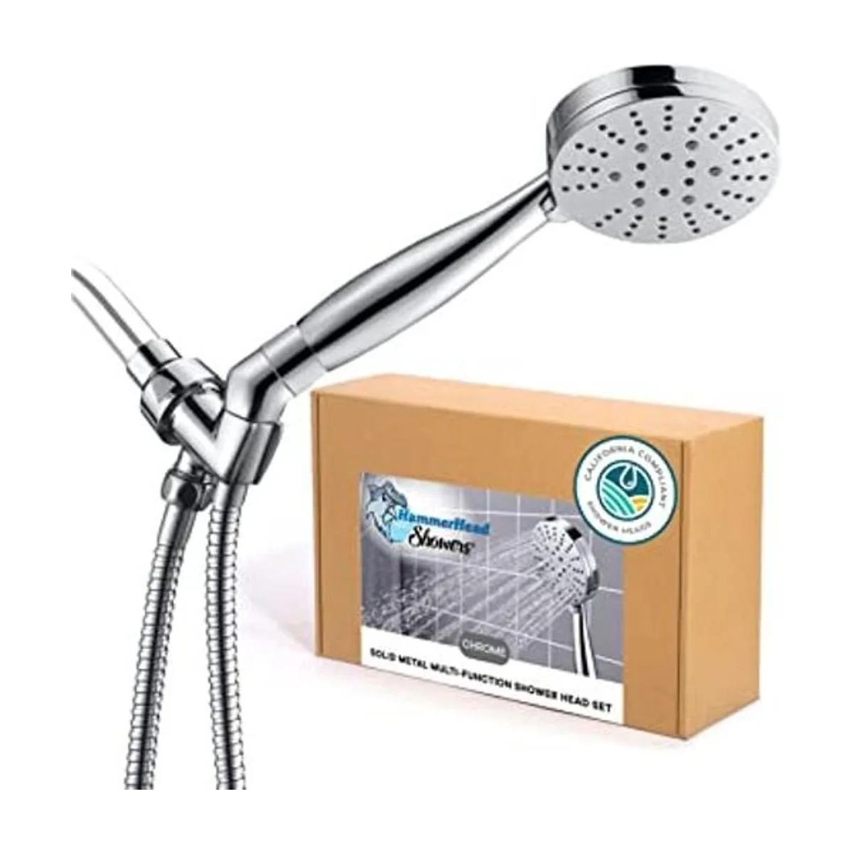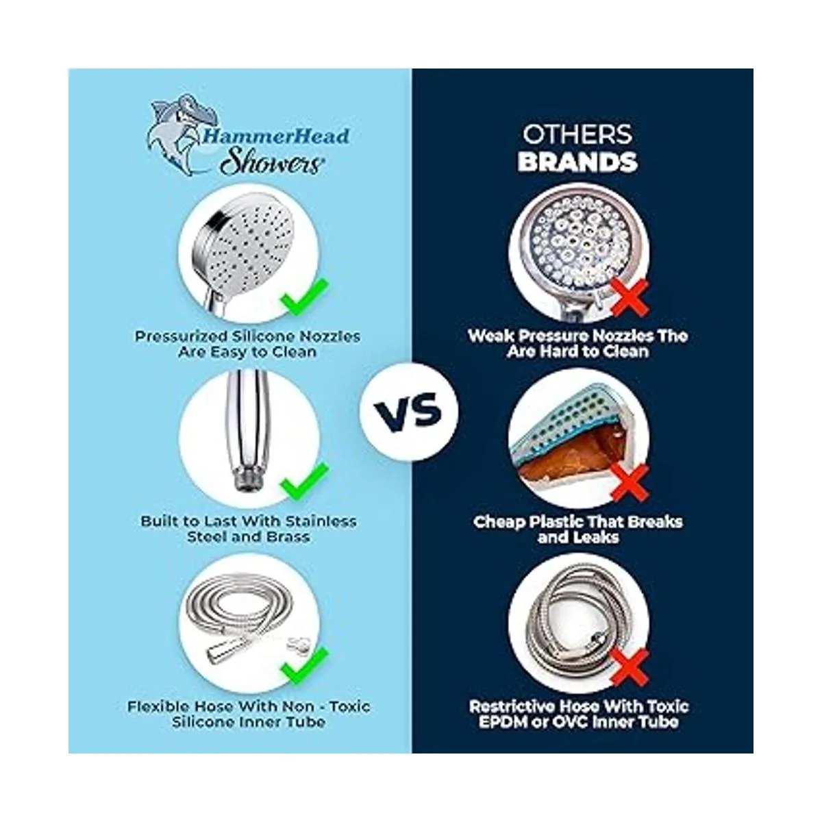 Mientras que otros juegos de cabezales de ducha de mano están hechos de plástico barato que se rompe y gotea después de unos meses, los productos HammerHead Showers están hechos de todo metal. Seleccionamos solo materiales de grado comercial de la más alta calidad, como latón y acero inoxidable 304, por lo que pasas menos tiempo reemplazando y más tiempo relajándote. Ducha de mano: 304 SS SOPORTE: latón MANGUERA: 304 SS Latón