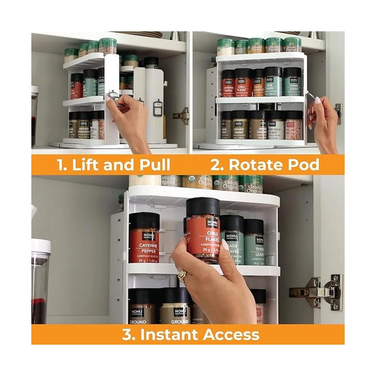Fácil instalación, fácil de usar. Llénalo, ajustando los estantes para adaptarse a tus artículos. A continuación, levanta el mango, tira y gira para un acceso fácil y instantáneo.