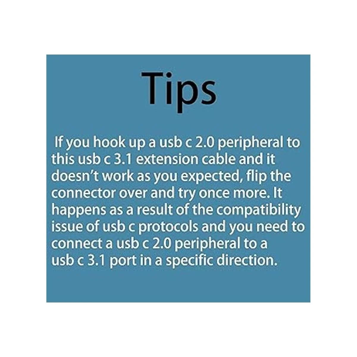 Consejos: si conectas un periférico USB C 2.0 a este cable de extensión USB C 3.1 y no funciona como esperas, gira el conector y vuelve a intentarlo. Se produce como resultado de la compatibilidad de los protocolos USB C y necesitas conectar un periférico USB C 2.0 a un puerto USB C 3.1 en una dirección específica.