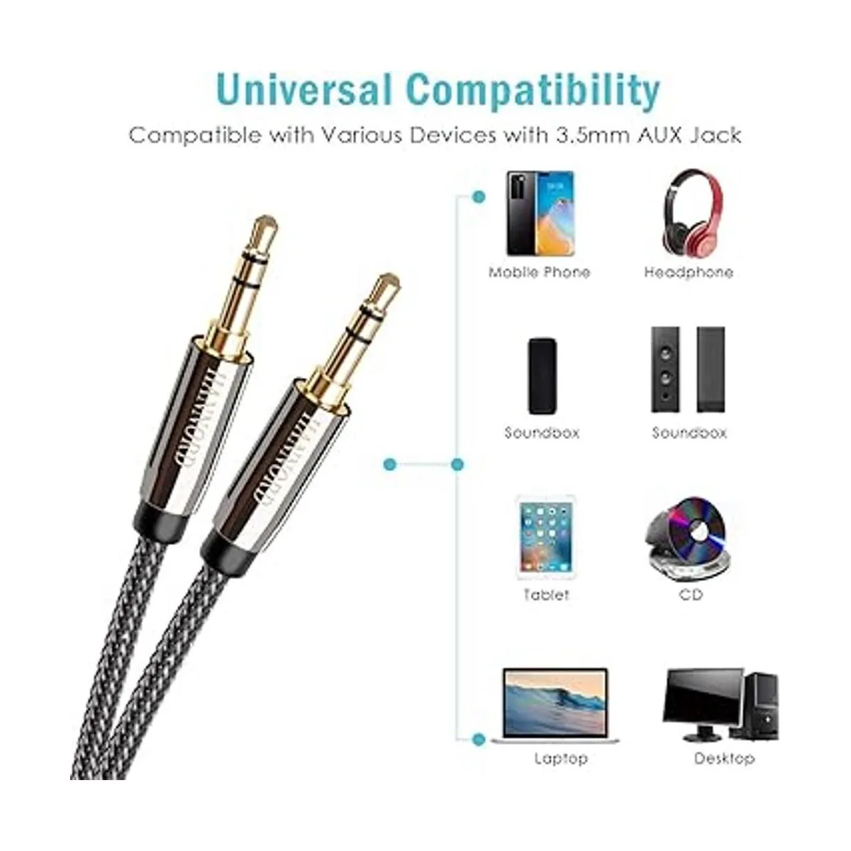 Compatibilidad universal: el cable de audio Hannord macho a macho de 0.138 in es compatible con dispositivos con un conector AUX estándar de 0.138 in, como iPhone, teléfono inteligente, estéreo del coche, estéreo, auriculares, tablet, altavoz, reproductor de MP3.