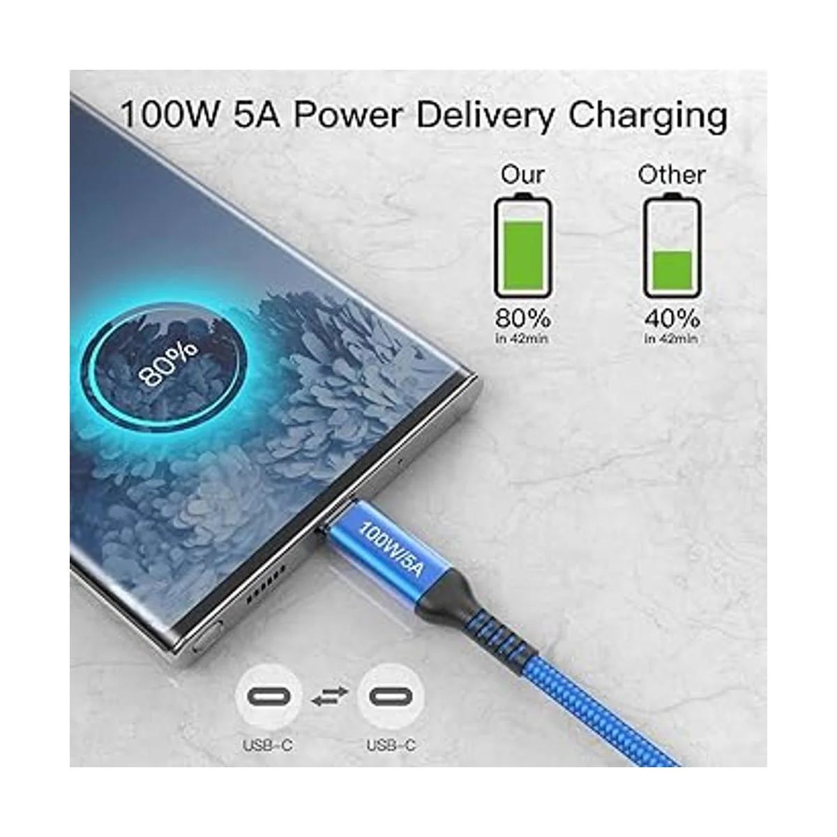 Cable de carga de 100 W y 5 A: cable de carga USBC a USBC de 100 W compatible con carga rápida QC/PD, ofrece de forma segura hasta 100 W/5 A de potencia. Nota: la velocidad de carga real depende de tu dispositivo y cargador de pared que utilices