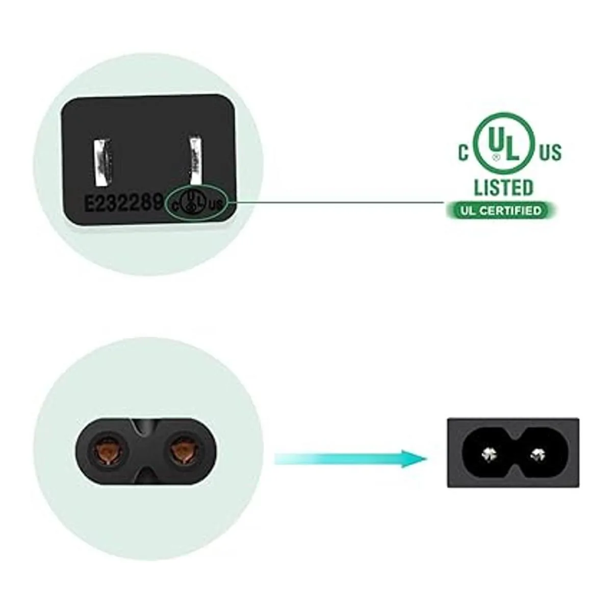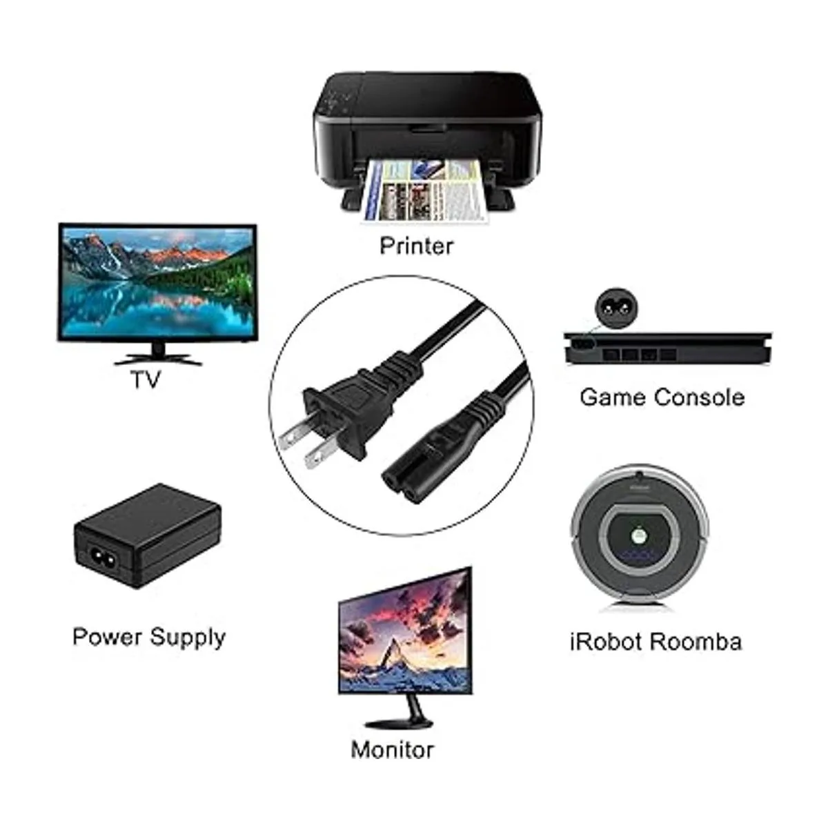 Compatibilidad: cable de alimentación de CA de alta calidad de 18 AWG con 2 ranuras IEC320 C7 a NEMA 115P, funciona para: consolas de juegos, TV LCD LED, monitor, barra de sonido, impresoras y otros dispositivos que requieren cable de alimentación de 2 ranuras.