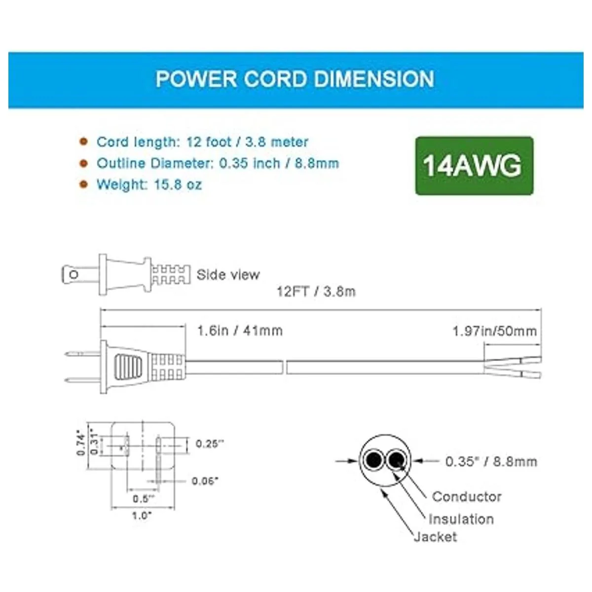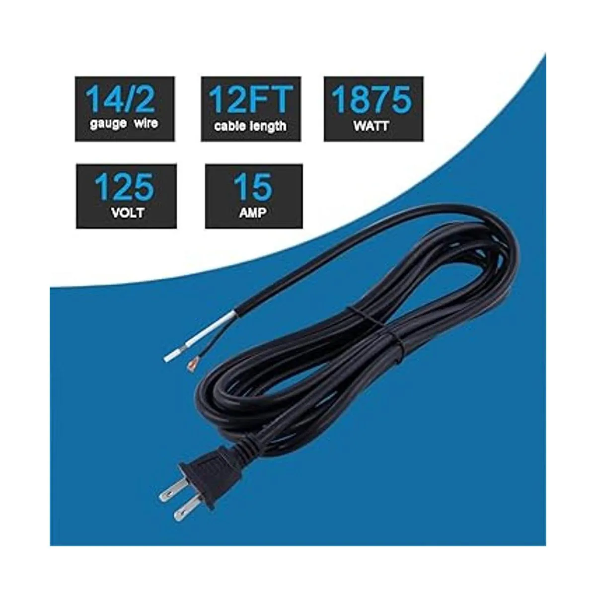 Cable de alimentación de repuesto 14 AWG polarizado, enchufe de 2 clavijas, coleta de 12 pies, calibre 14, cable de CA SJT, cable de alimentación de repuesto, redondo, resistente, 2C, extremo abierto, 120 V, 15 A, 1875 W, para herramientas eléctricas