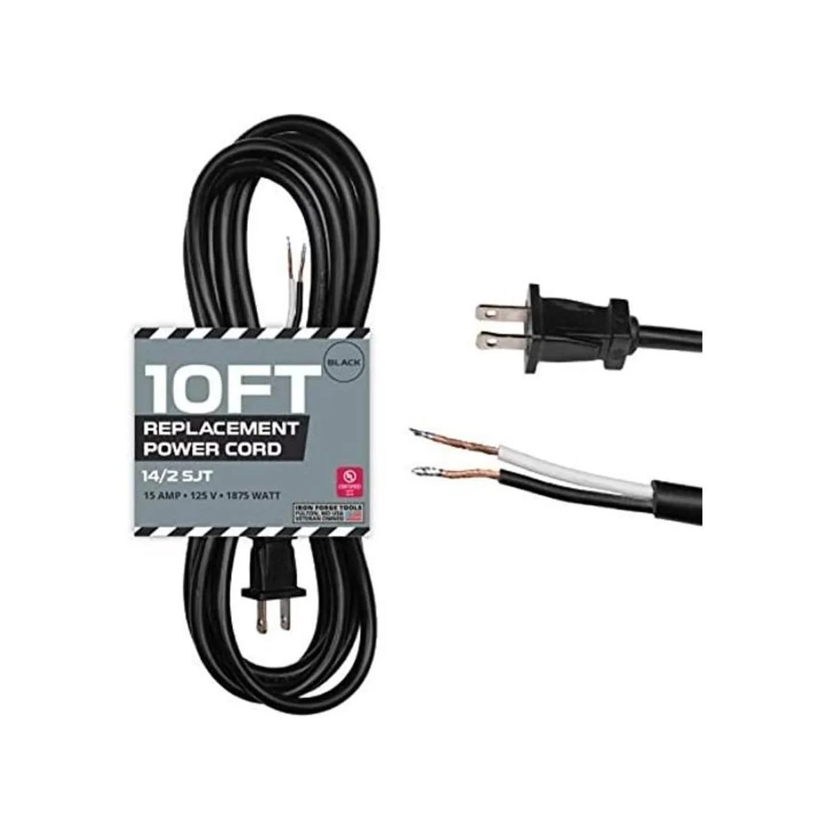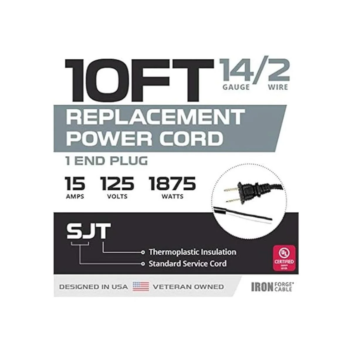 Certificado UL, 2 cables, calibre 14, 10 pies, 15 amperios, 125 voltios, 1875 vatios. Propiedad de veteranos.