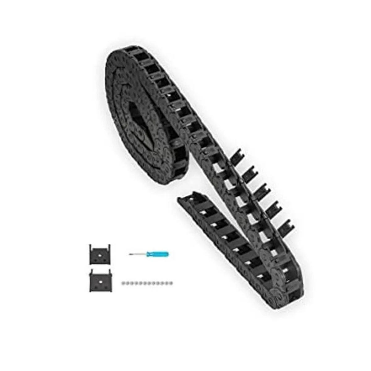 Extra: un par de conectores extra, puede dividir la cadena de arrastre integral en 2 piezas para usar; 12 tornillos adicionales, fácil de fijar la cadena; destornillador extra, desmonta libremente para cambiar la longitud de la cadena y abrir la cubierta lateral de la misma.
