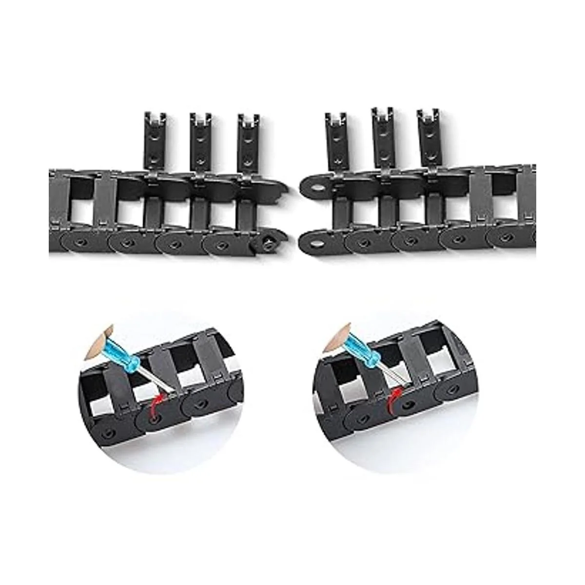 Flexible: cada sección de la cadena de arrastre se puede abrir para una fácil instalación y mantenimiento. También puedes montar libremente la longitud según lo necesites.