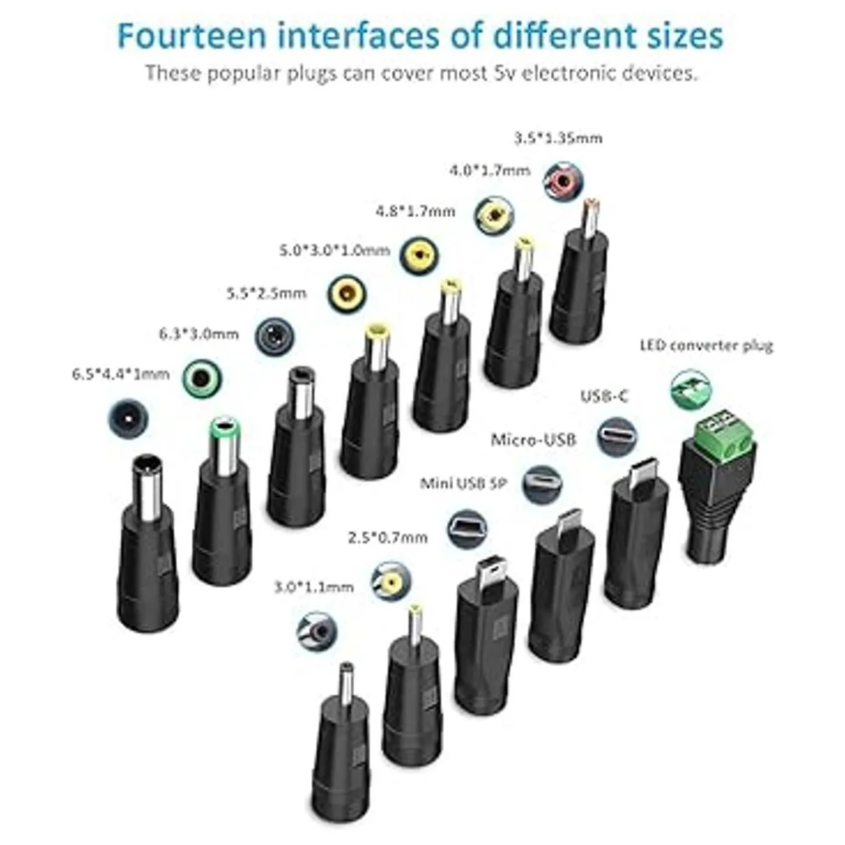14 conectores de CC intercambiables, lo que hace que se adapte a la mayoría de electrodomésticos. No tienes que preocuparte por encontrar los adaptadores adecuados cuando se utilizan varios dispositivos.