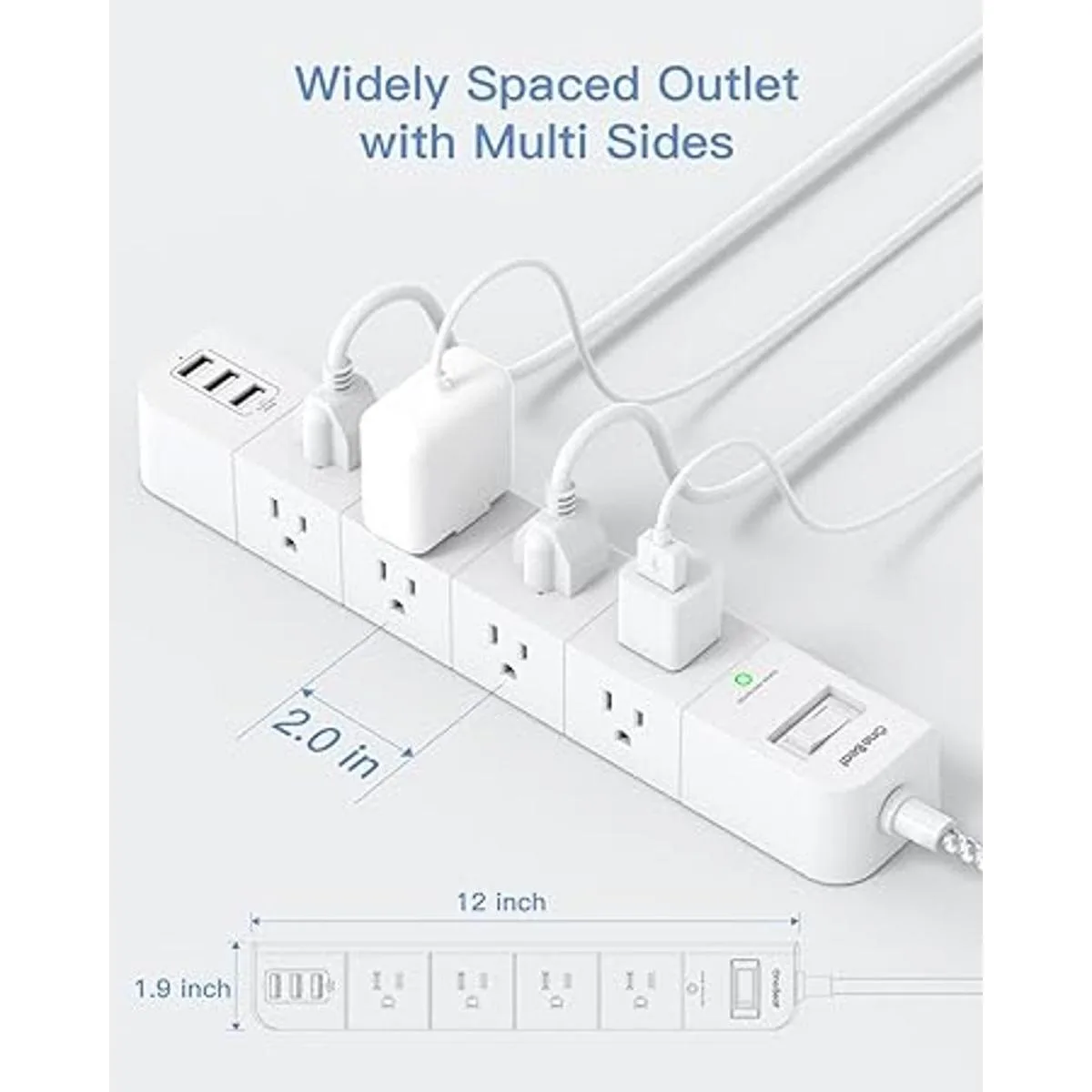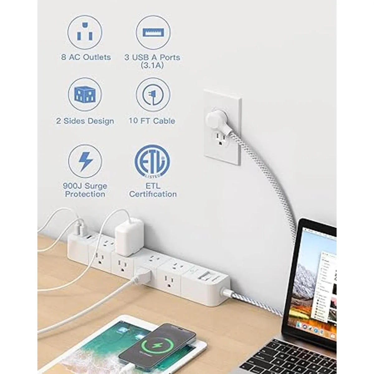 Cable de extensión de 10 pies, protector de sobretensiones de regleta de alimentación, 8 tomas de corriente alterna, 3 USB, enchufe plano, estación de carga de escritorio con protección contra sobrecarga, soporte de pared para hogar, oficina, viajes, computadora con certificación ETL
