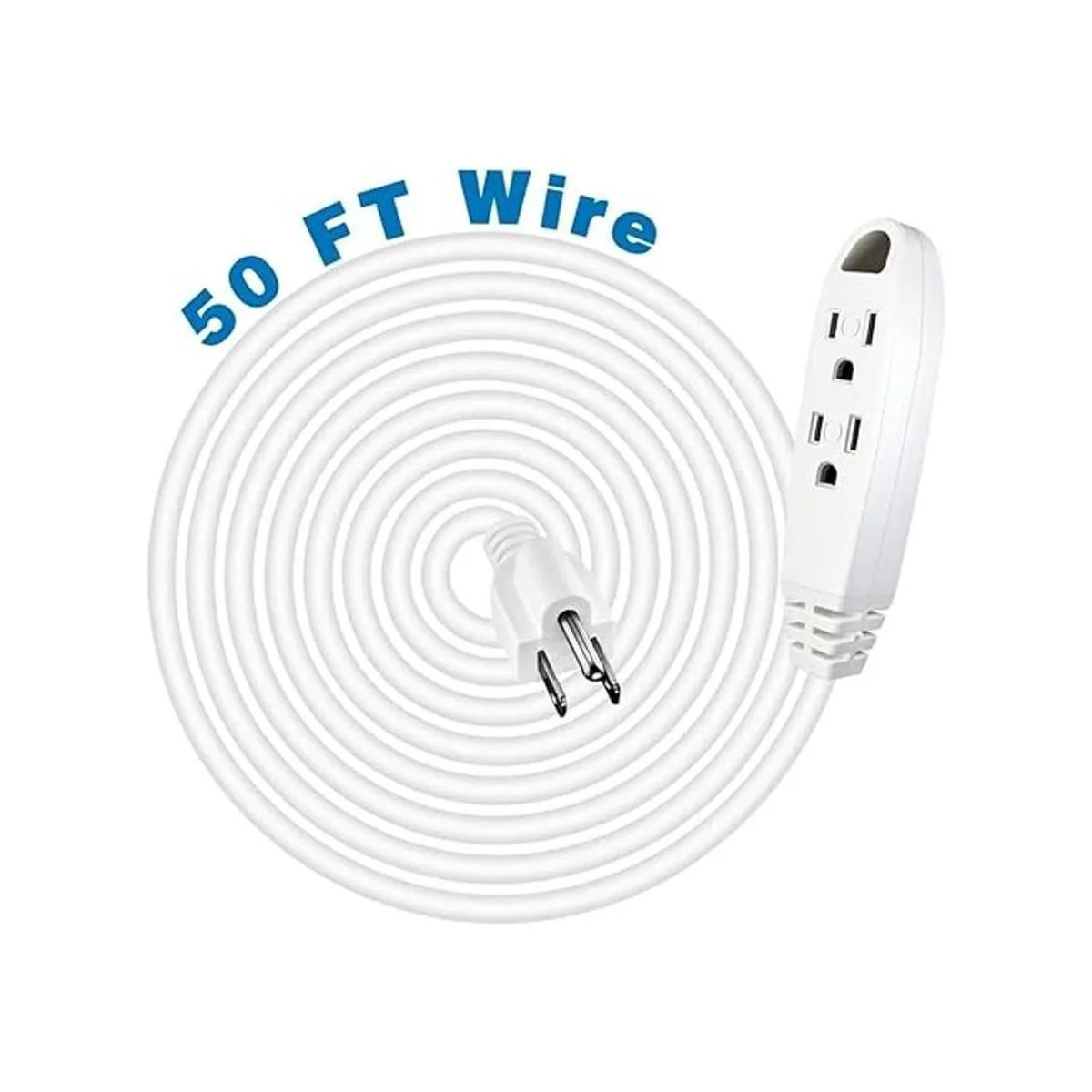 Tres tomas: conecta 3 aparatos a la vez y tiene un cable de 50 pies a la toma de pared. Conexión a tierra de 3 cables, 13 amperios, 125 V, 1625 vatios, como una mini tira de alimentación con un cable largo.