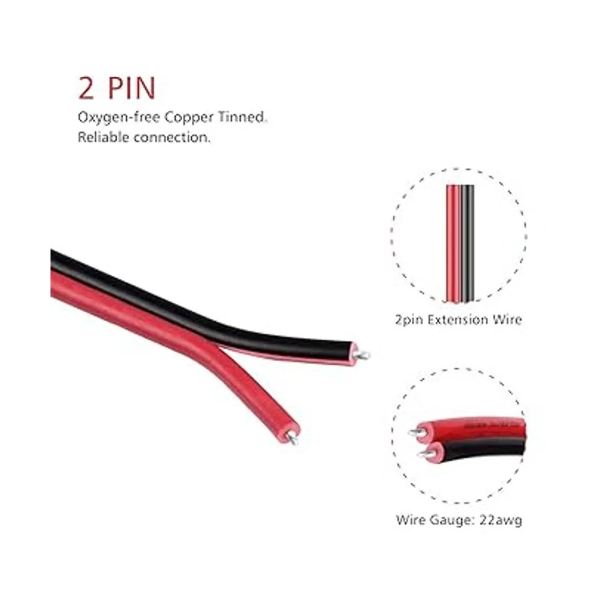Calidad premium: cobre sin oxígeno de alta pureza con chapado en estaño, 22 AWG 2 conductores y PVC de alta calidad, buena conductividad, alta resistencia mecánica, retardante de llama, antienvejecimiento, resistencia a ácidos y álcalis y a prueba de humedad.