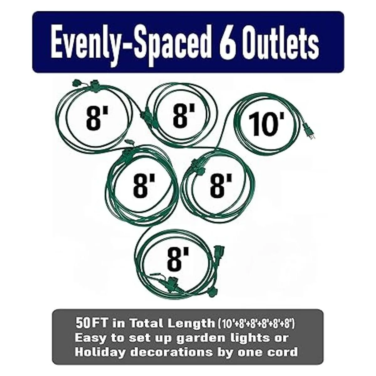 Cable de extensión para exteriores con múltiples tomas, espaciado uniformemente con cubierta resistente a la intemperie, cable verde ideal para decoración de Navidad, luces de jardín, patio, 16AWG3C SJTW, listado ETL 50 pies 6 tomas