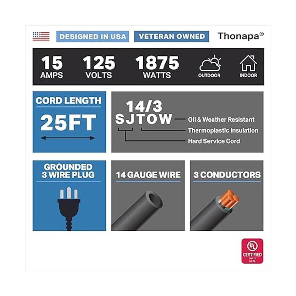 Listado UL, propiedad de veteranos. Cable de extensión de 3 cables, 25 pies, 15 amperios, 125 voltios, 1875 vatios. Rango de temperatura: 40F a 140F