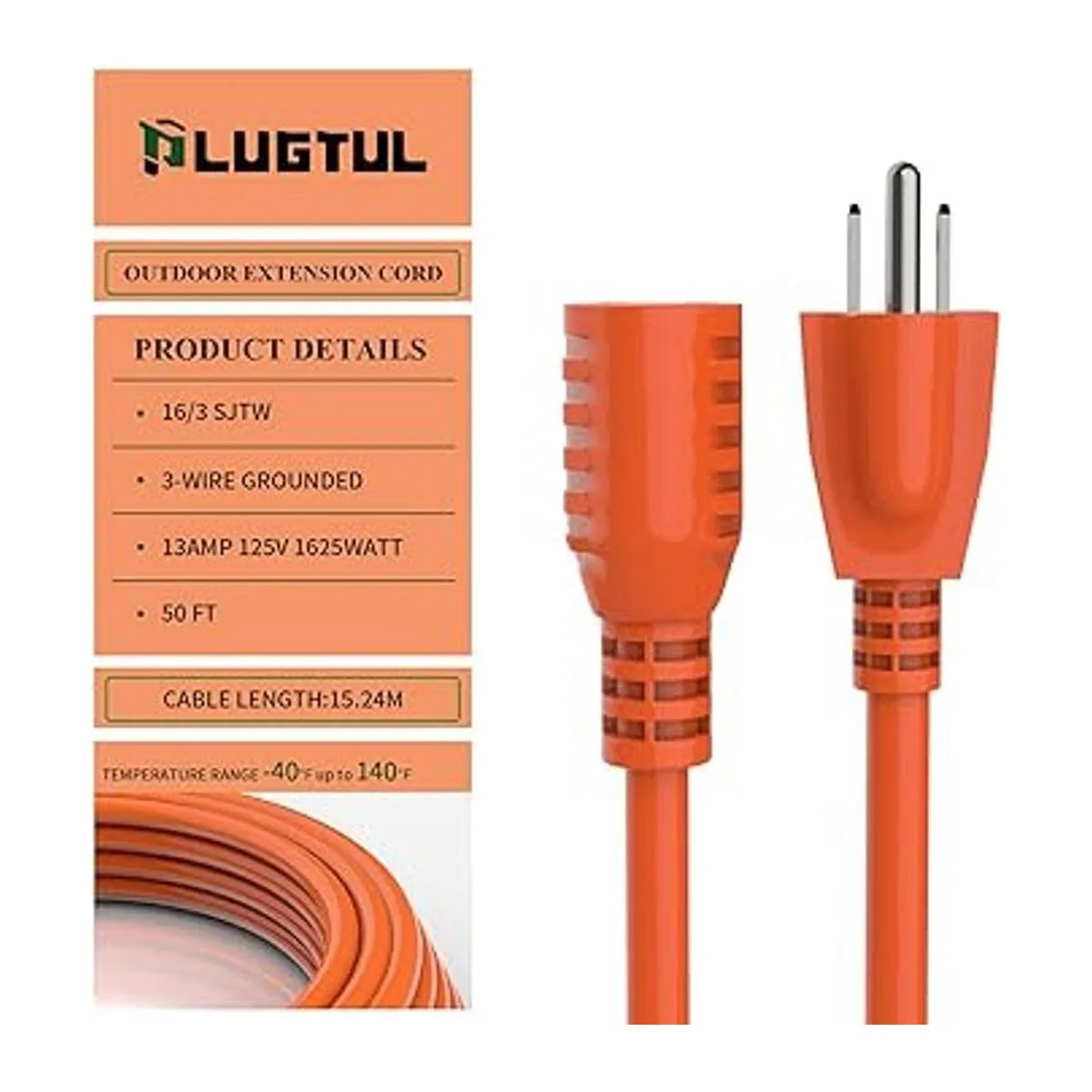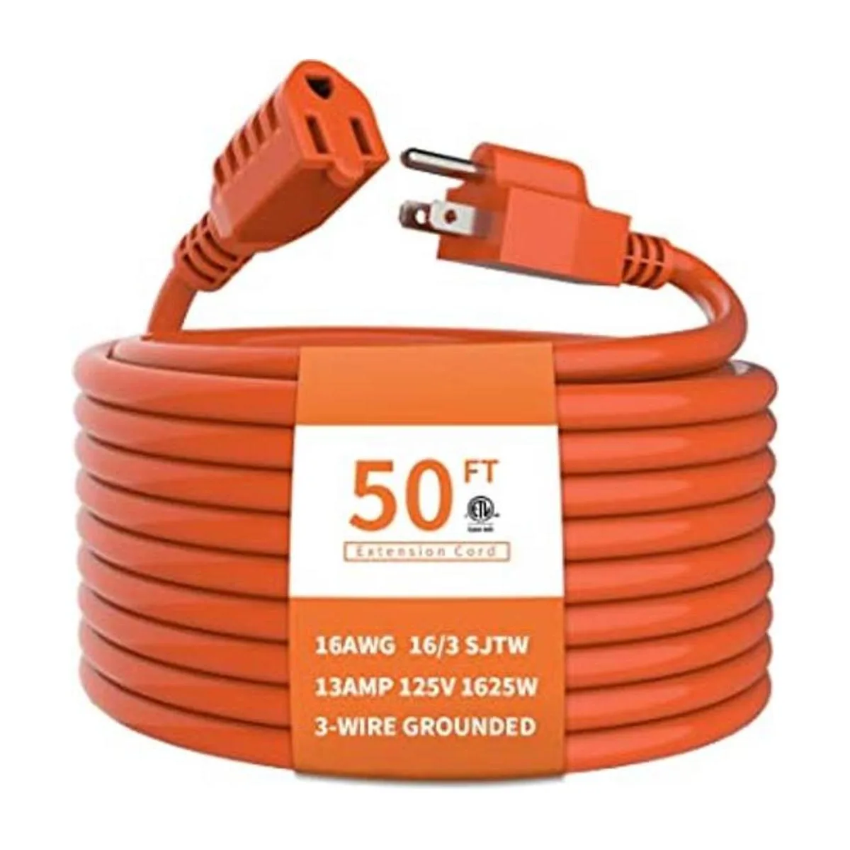 Especificaciones: cable de extensión para exteriores 16/3 de 50 pies, calibre 16 con 3 conductores de alambre de cobre puro de 125 V, 13 amperios, 1625 vatios, enchufe macho NEMA515P, enchufe hembra NEMA515R, cable SJTW, listado ETL.