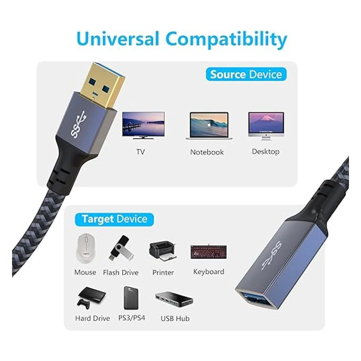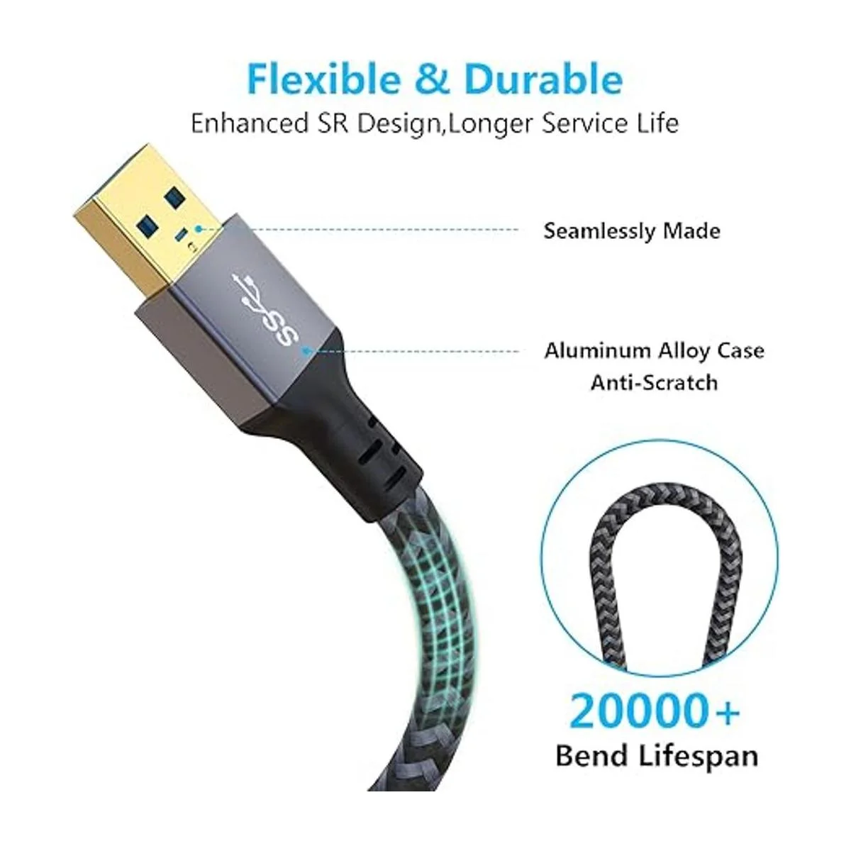 Flexible y duradero: este cable de extensión USB a USB triple blindaje de cobre estañado, lámina de aluminio y cable de tierra garantizan una transferencia de datos estable y rápida sin ruido ni pérdida de señal. El nailon trenzado flexible y resistente al desgaste hace que el cable se doble más de 10000 flexiones, sin preocupaciones de enredos y más duradero para una vida útil más larga