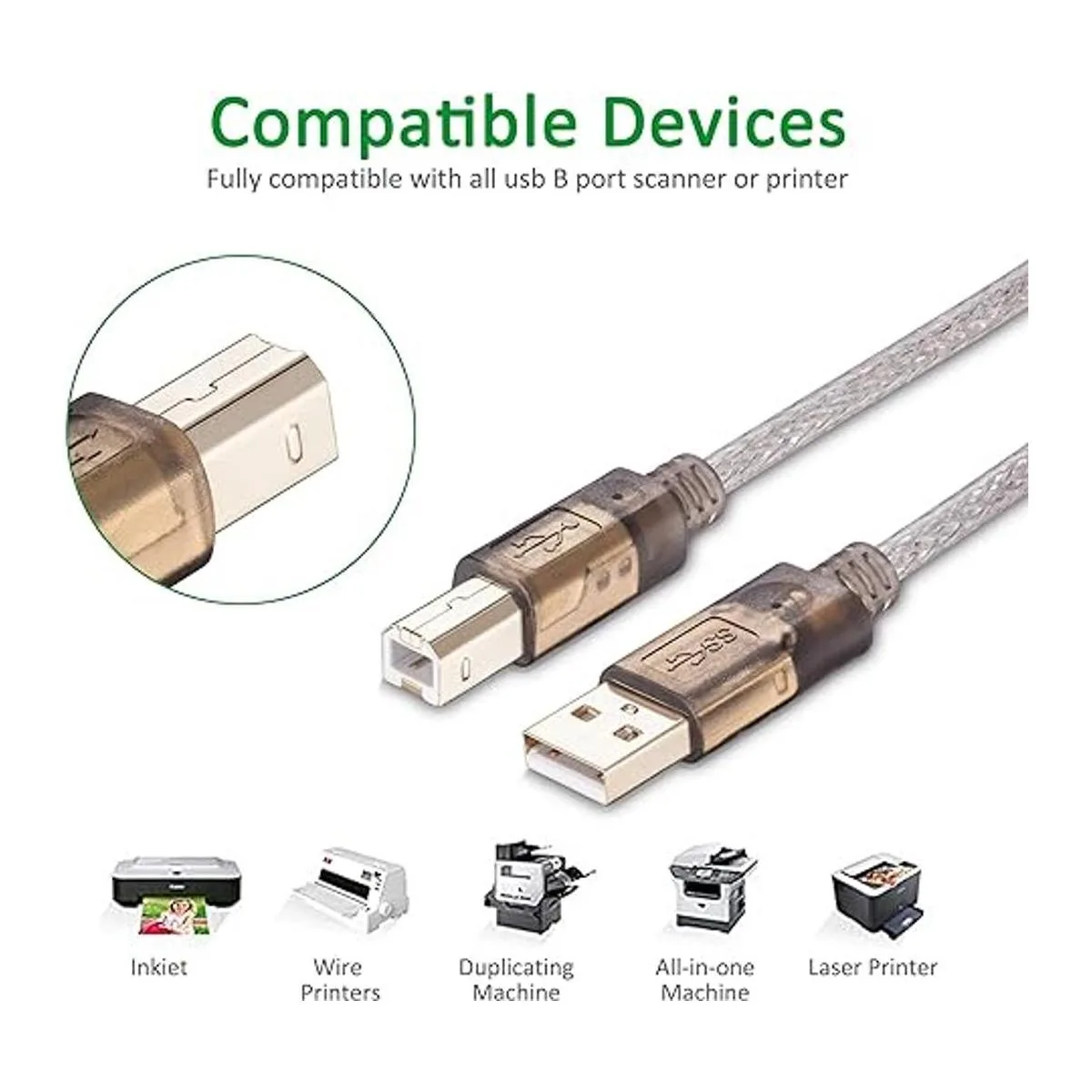 Utilizado con impresoras con interfaz USB tipo B estándar como la serie HP, por ejemplo, Deskjet/Officejet, Canon, Pixma, Lexmark,Dell, Brother, etc.