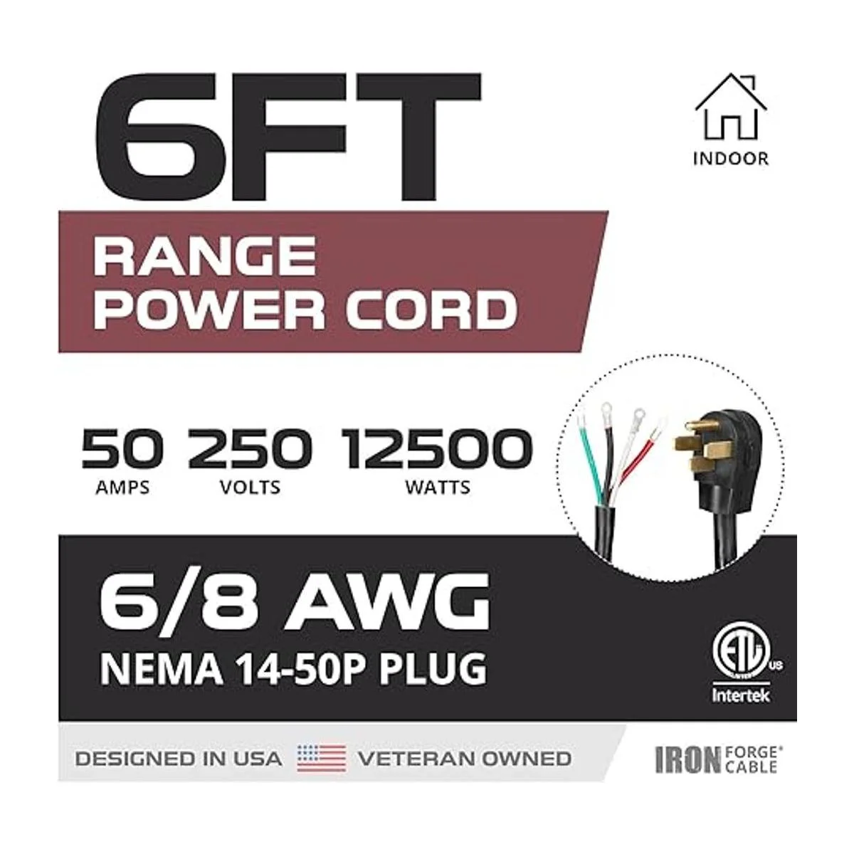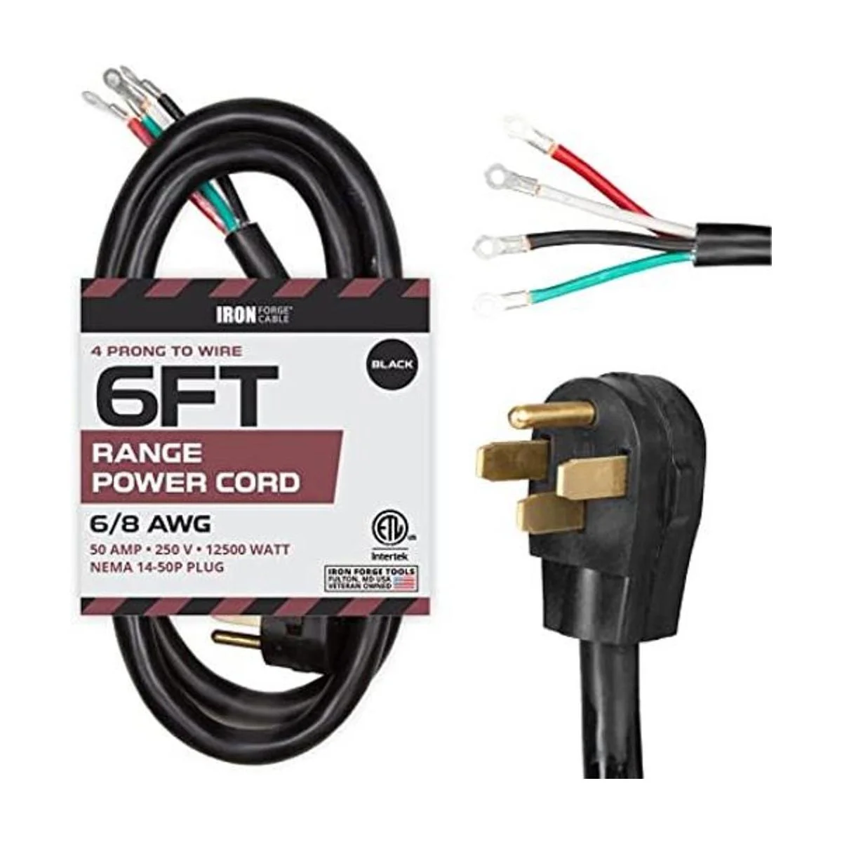 Listado ETL, cable de alimentación de 4 clavijas a cable, 6/8 AWG, 6 pies, 50 amperios, 250 voltios, 12500 vatios, enchufe NEMA 1450P. Propiedad de veteranos.