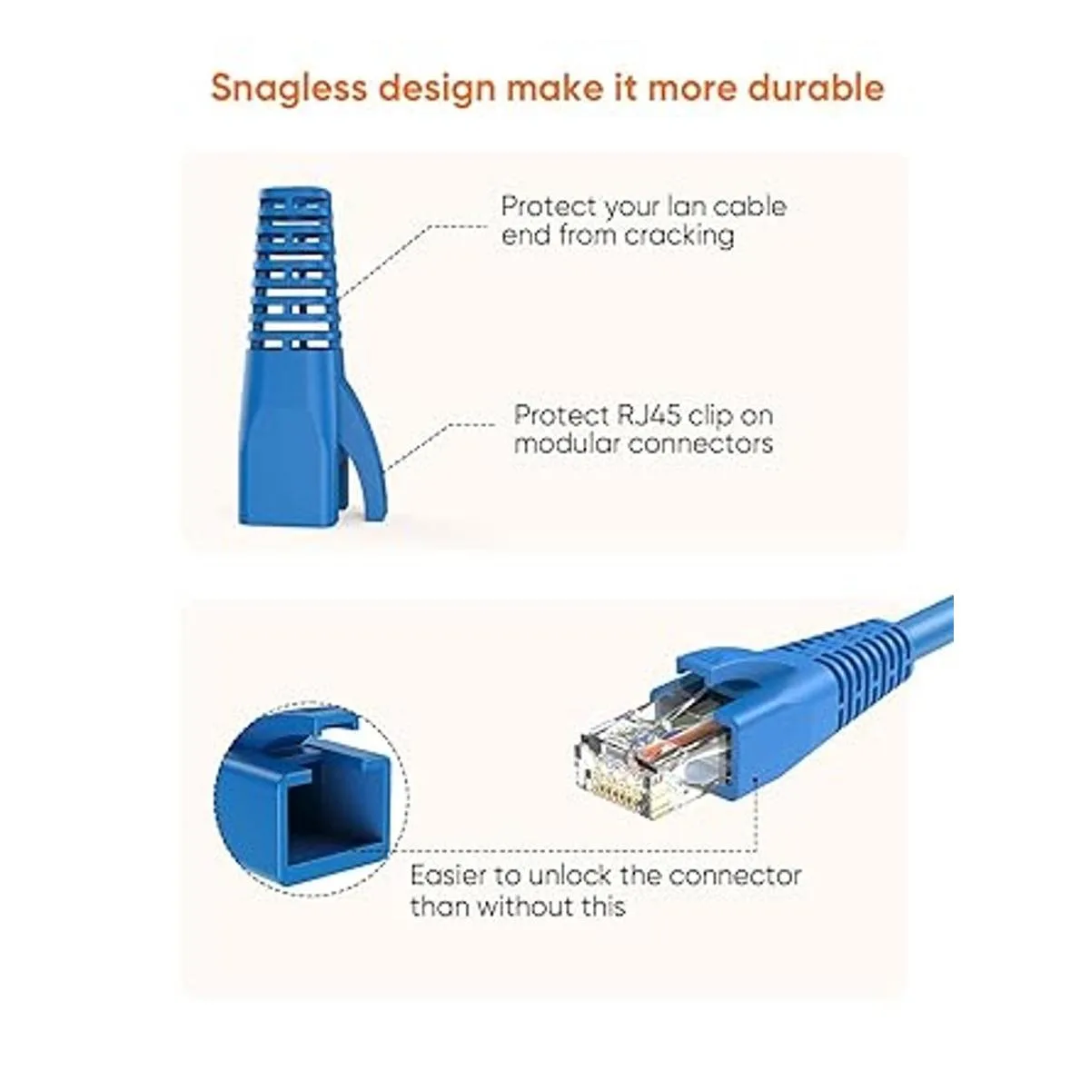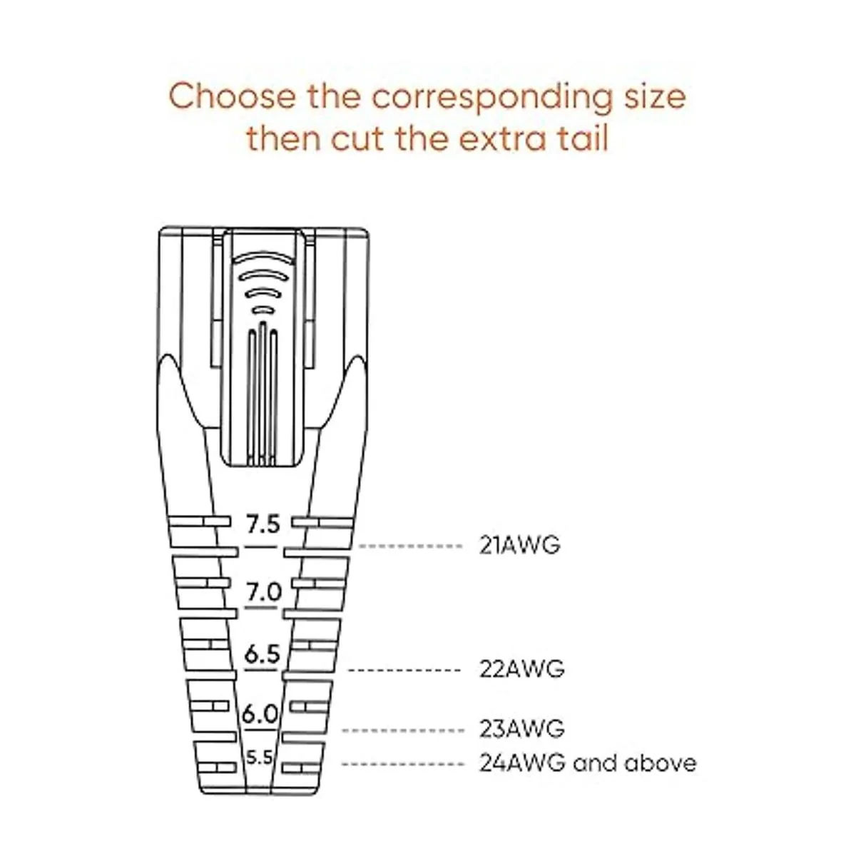 Para cable de conexión OD de 5,5 0.295 in se adapta a 21 AWG/22 AWG/23 AWG/24 AWG y superior, de acuerdo con la marca de tamaño en la cubierta de cable de red RJ45, puedes elegir la longitud que necesitas.